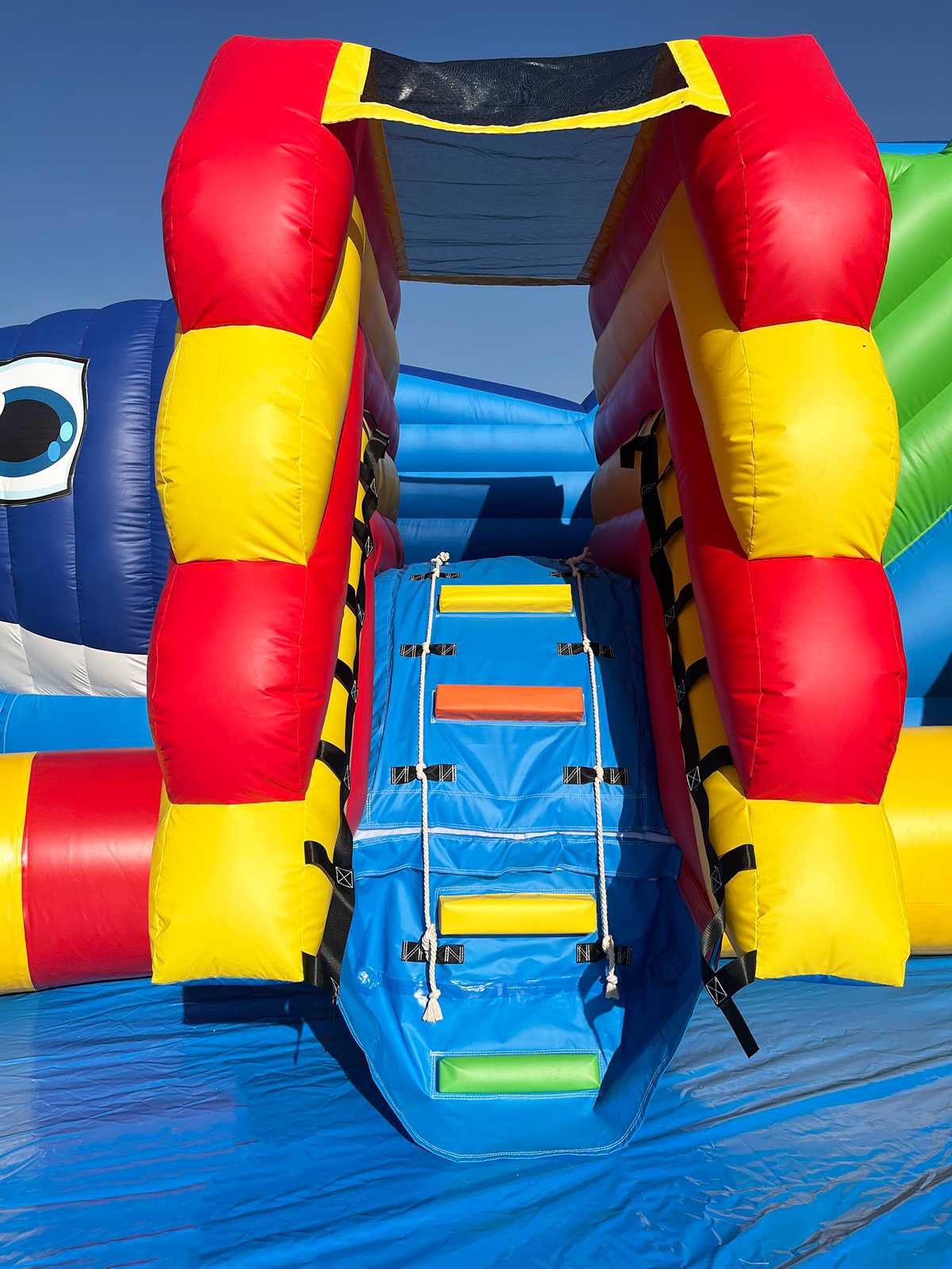 Аквапарк изготавливается из армированного ПВХ толщиной от 0,55 до 0,9 мм с плотностью до 1100 г/м². Используемый материал обеспечивает высокую прочность и устойчивость к нагрузкам. Постоянный поддув сохраняет стабильную форму комплекса на протяжении всей эксплуатации. На аттракционе предусмотрены три скоростных ската с начальной высотой 3,5 м от земли, а аквапарк с шириной 17 м позволяет комфортно перемещаться и избежать заторов при высокой проходимости. Все элементы прошли сертификацию по требованиям безопасности ТР ЕАЭС 038/2016.