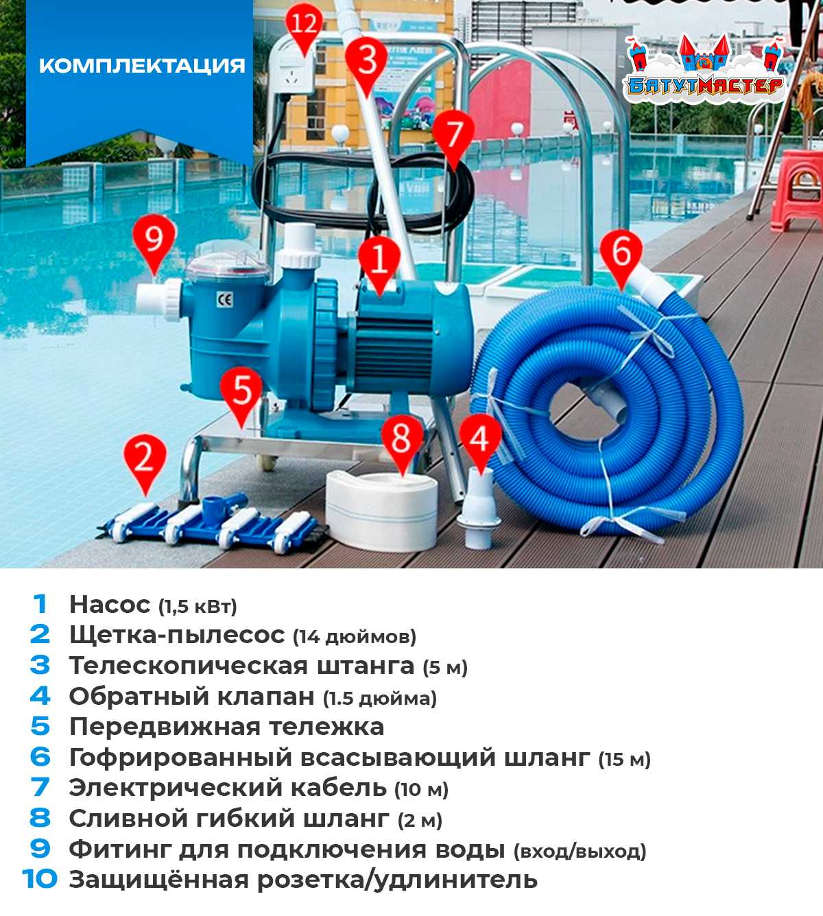 Набор для чистки бассейна с насосом 1,5 кВт и пылесосом — усиленное решение для поддержания идеальной чистоты в бассейнах площадью до 100 м². Повышенная мощность, быстрая очистка, удобная работа без спуска в воду.