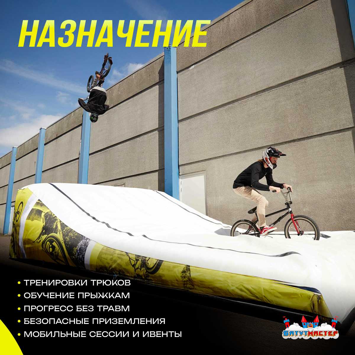 "BikeAir" — это компактная и мобильная надувная подушка, предназначенная для отработки велотрюков и прыжков. Она обеспечивает минимальный риск травм, позволяет тренироваться чаще и увереннее. Благодаря многокамерной конструкции и возможности регулировки давления, вы можете настраивать жёсткость под себя, в зависимости от веса, стиля катания и уровня подготовки.