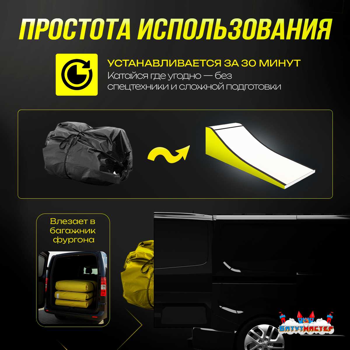 - Установка: до 30 минут, вмещается в багажник фургона