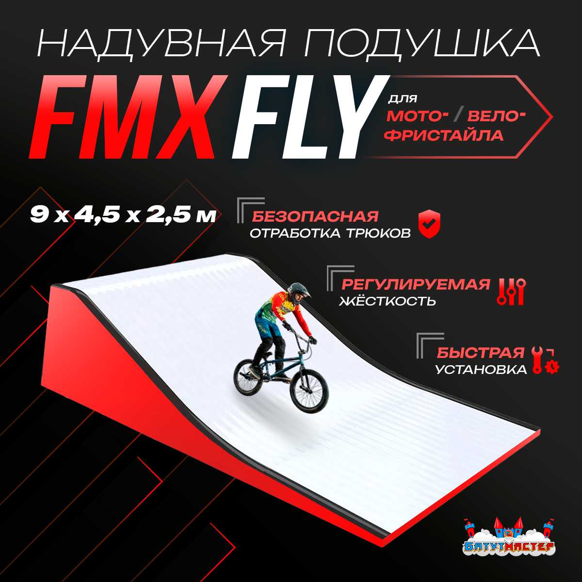 «FMXFly» — это надувная подушка, созданная для тех, кто живёт трюками, скоростью и полётами. Если вы — райдер, тренер, организатор шоу или просто фанат мото- и вело-фристайла, перед вами инструмент, который открывает новые возможности для тренировок и выступлений.