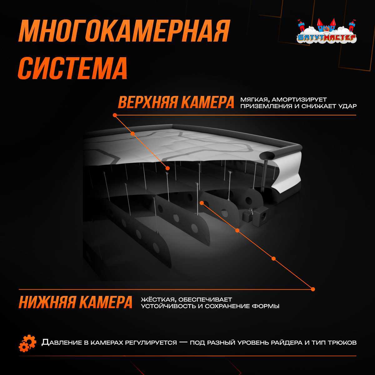 - Нижняя камера — жёсткая, удерживает форму и не даёт пробить подушку до земли даже при высоком падении.
