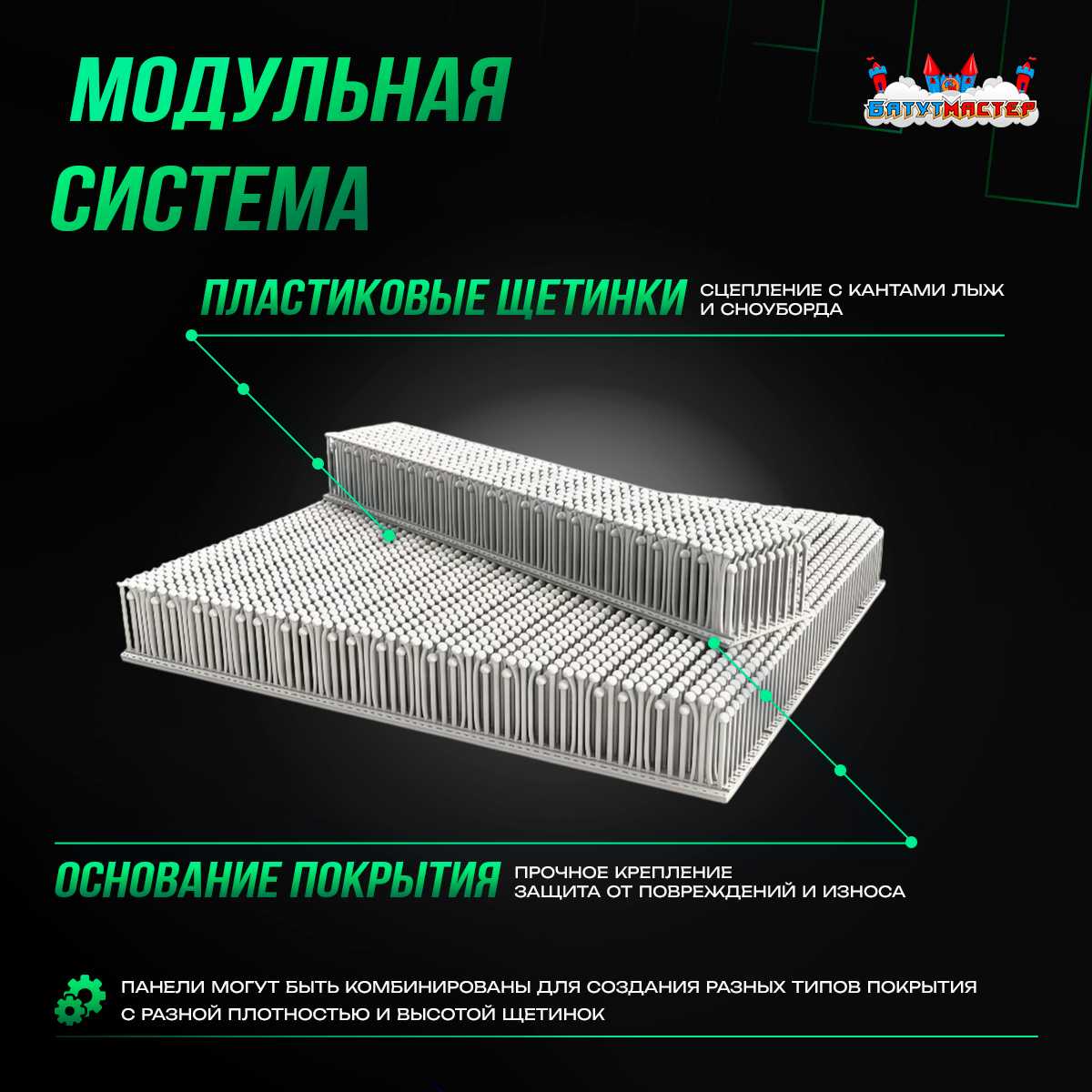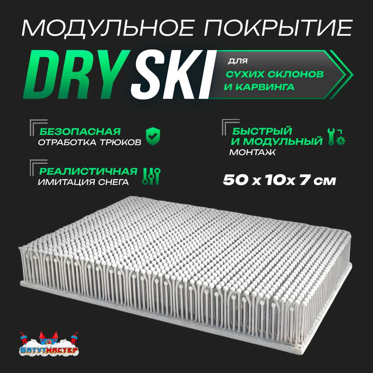 «DrySki» — это прорыв в тренировках по горным лыжам и сноуборду без необходимости настоящего снега. Материал имитирует поведение лыж или доски на ухоженном снежном склоне, при этом устойчив к износу и прост в монтаже. Основной элемент покрытия — модули с гибкими пластиковыми щетинками, создающими сцепление с кантом и снижающими риск травм.