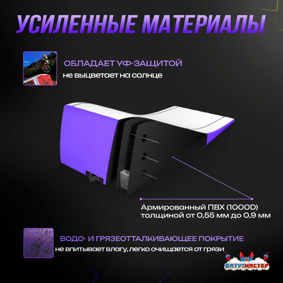 Для изготовления используется армированный ПВХ 1000D толщиной от 0,55 до 0,9 мм с УФ-защитой, что предотвращает выцветание на солнце. Поверхность имеет водо- и грязеотталкивающее покрытие — влага не впитывается, а загрязнения легко удаляются.