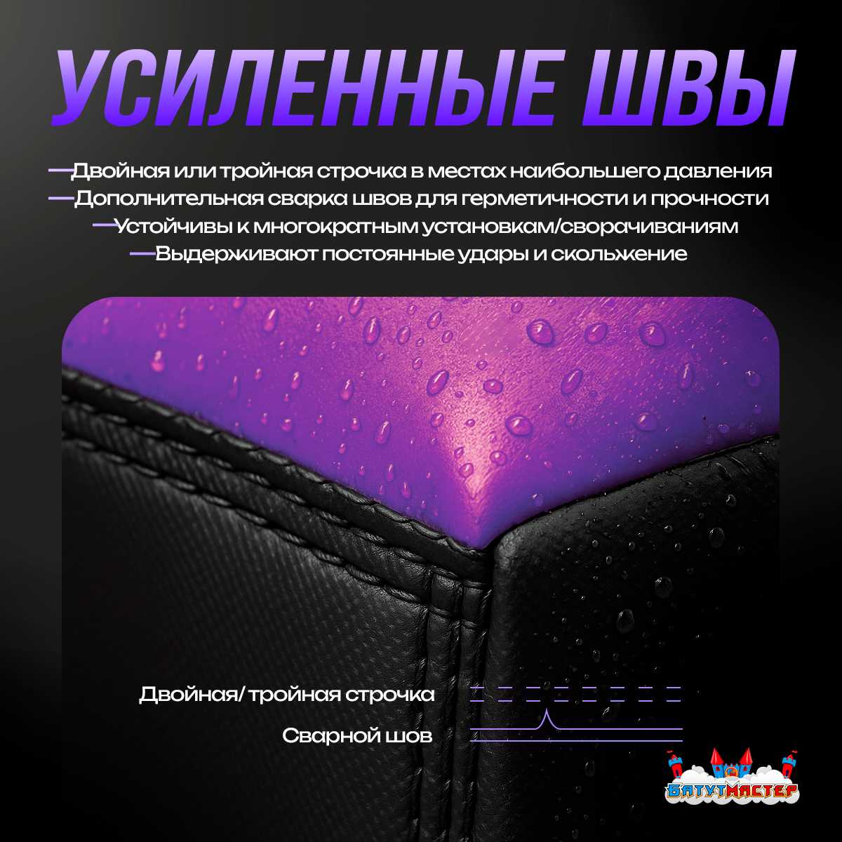 Швы выполнены с двойной/тройной строчкой и дополнительно сварены, обеспечивая герметичность и высокую прочность даже при постоянных нагрузках.