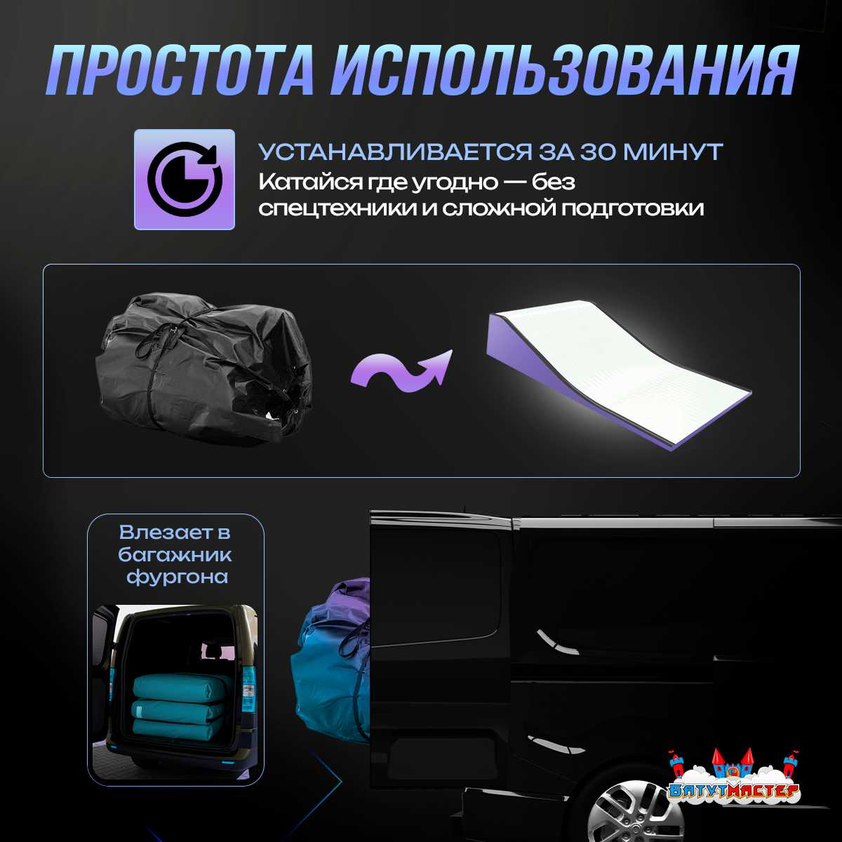 "RideSlop" в сложенном виде компактно размещается в багажнике фургона. В комплекте предусмотрена сумка для переноски. Лёгкий монтаж и демонтаж делают подушку отличным выбором для мобильных тренировок и выездных шоу.