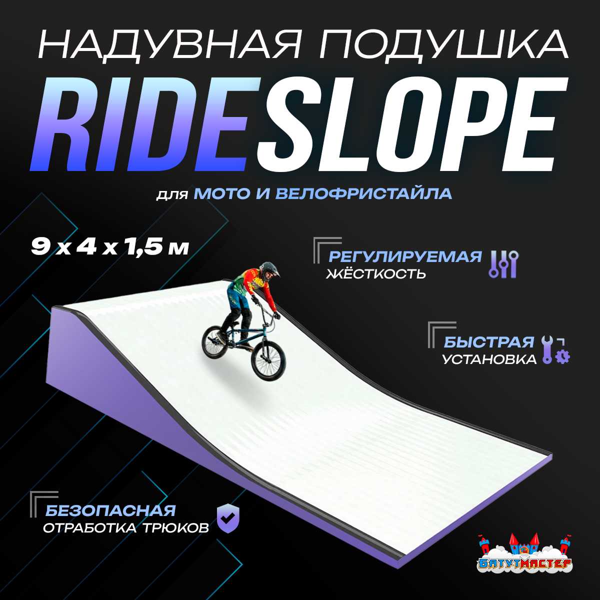 "RideSlop" — профессиональное решение для райдеров, которые хотят отрабатывать сложные трюки с максимальной безопасностью. Подушка имеет размеры 9×4×1,5 м, легко транспортируется и устанавливается всего за 30 минут без привлечения спецтехники. Благодаря продуманной конструкции она подходит для тренировок, шоу-программ и соревнований.