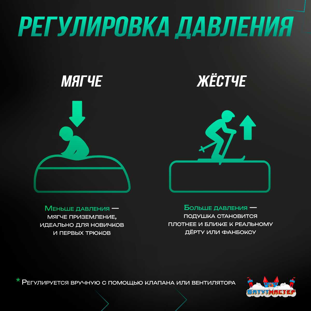 - Регулировка давления позволяет подобрать оптимальную жёсткость: мягче для новичков и отработки первых трюков, жёстче для имитации реальных дёртов или фанбоксов.