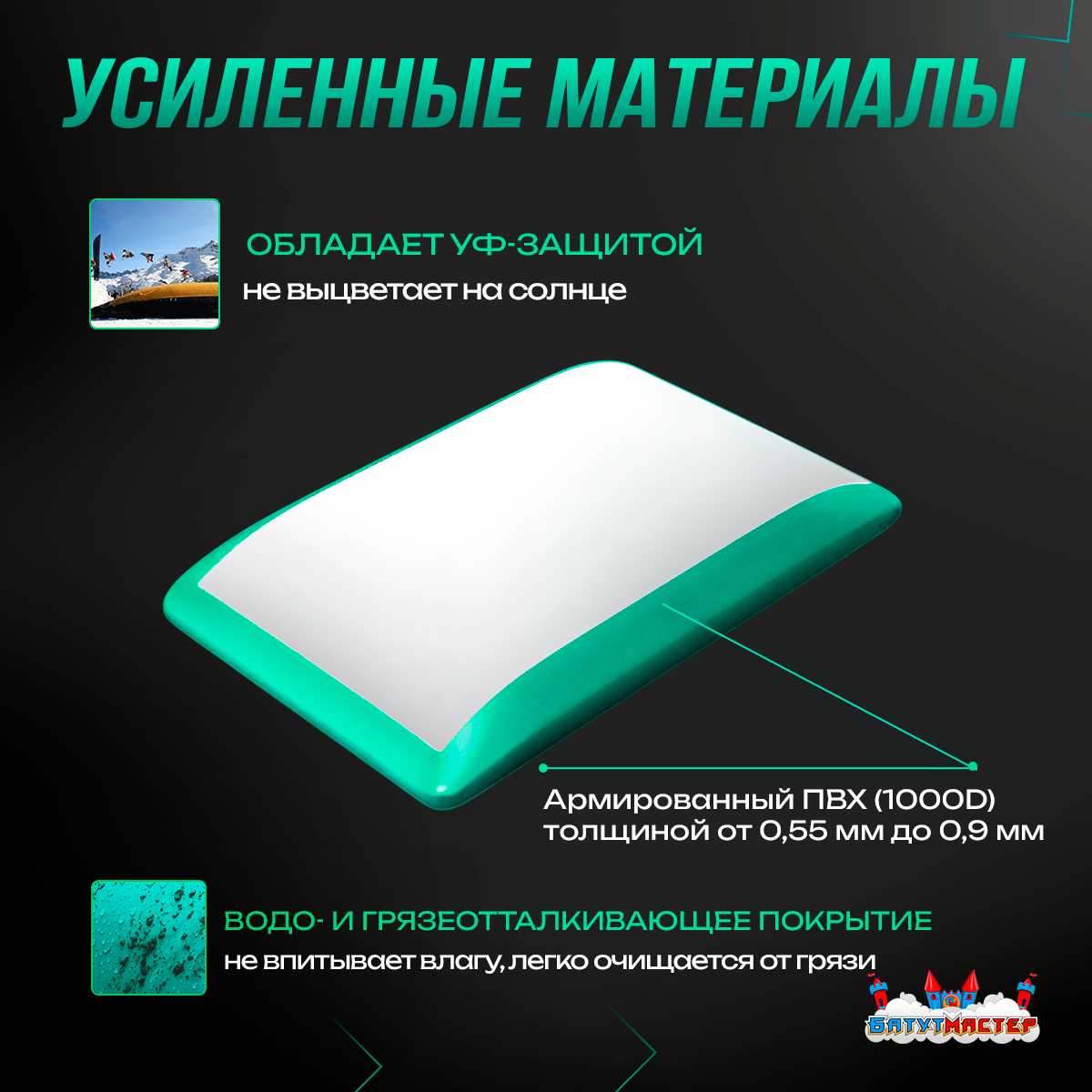 - Армированный ПВХ (1000D) толщиной от 0,55 мм до 0,9 мм — прочный, устойчивый к истиранию и погодным условиям.