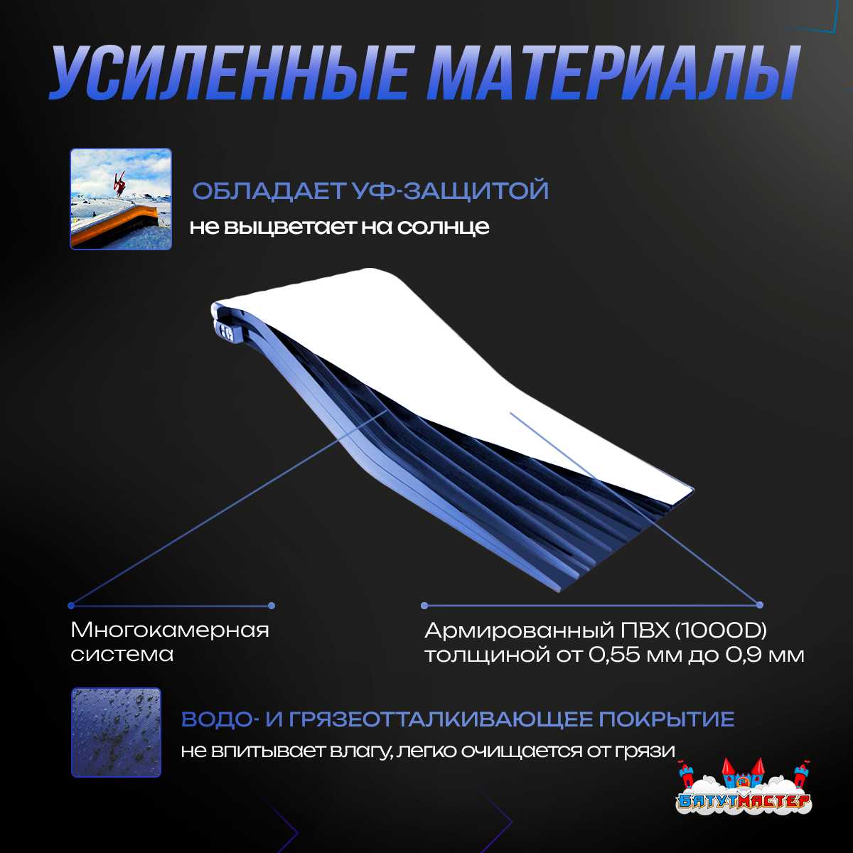 - Усиленные материалы — армированный ПВХ (1000D), толщина от 0,55 до 0,9 мм.