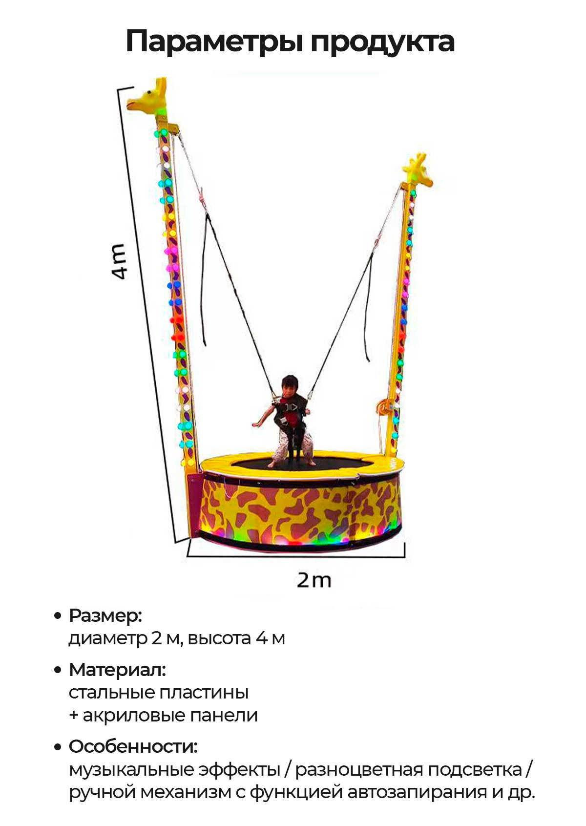 Банджи-батут «Жираф-джамп» — это не просто развлечение, а праздник света и улыбок! 🦒💫 Его яркий дизайн и эффектная подсветка создают атмосферу добра и веселья, а прочная конструкция и надёжная страховка обеспечивают полную безопасность. Этот батут станет любимцем детей и украшением вашей площадки — ведь где появляются «Жирафы», там всегда радость, смех и очередь желающих прыгнуть ещё раз! 🎉
