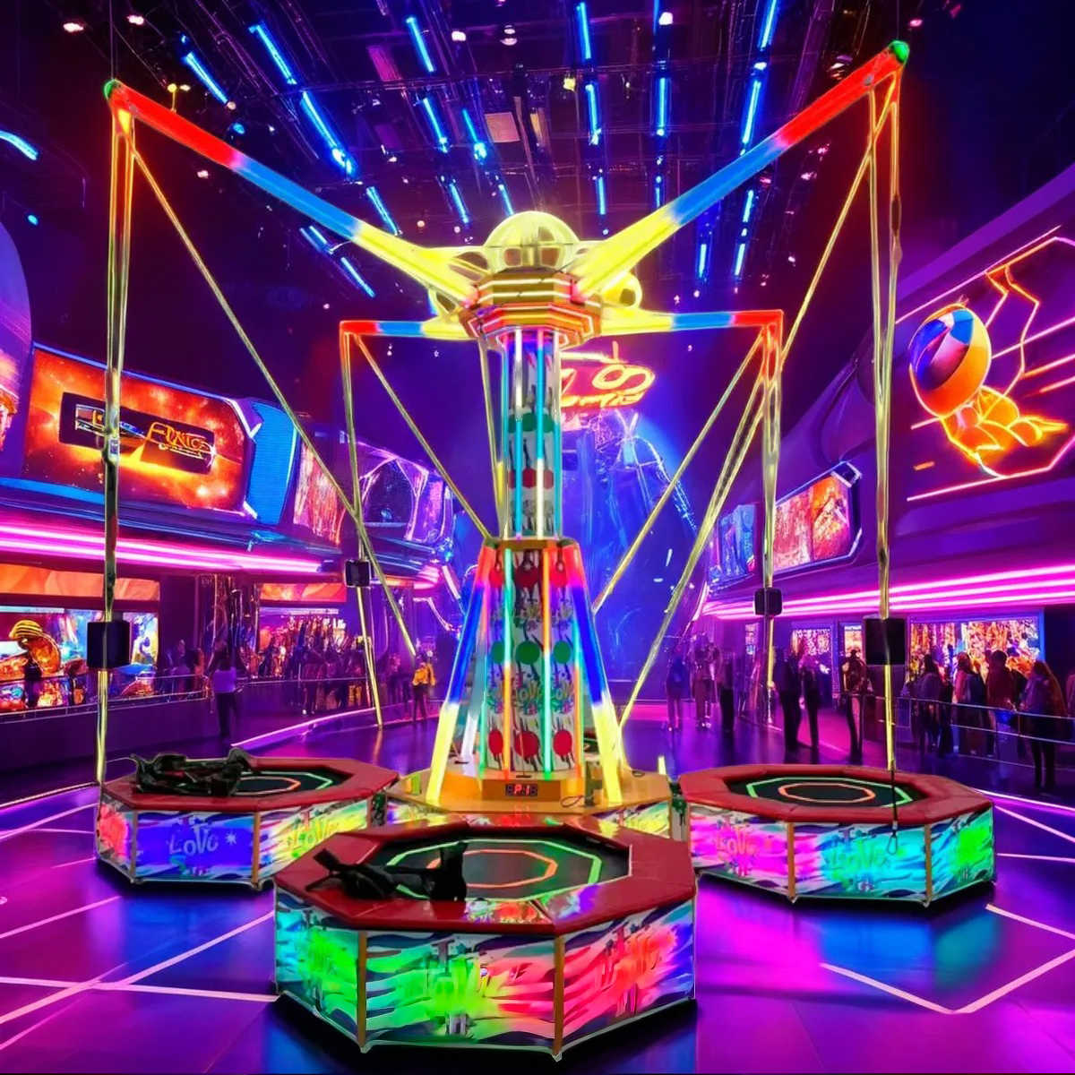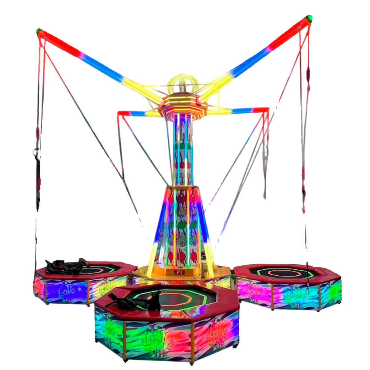 Банджи-батут «Неоновый калейдоскоп» — это 4-местный аттракцион нового поколения, объединяющий новейшие технологии и эффектный визуальный дизайн.