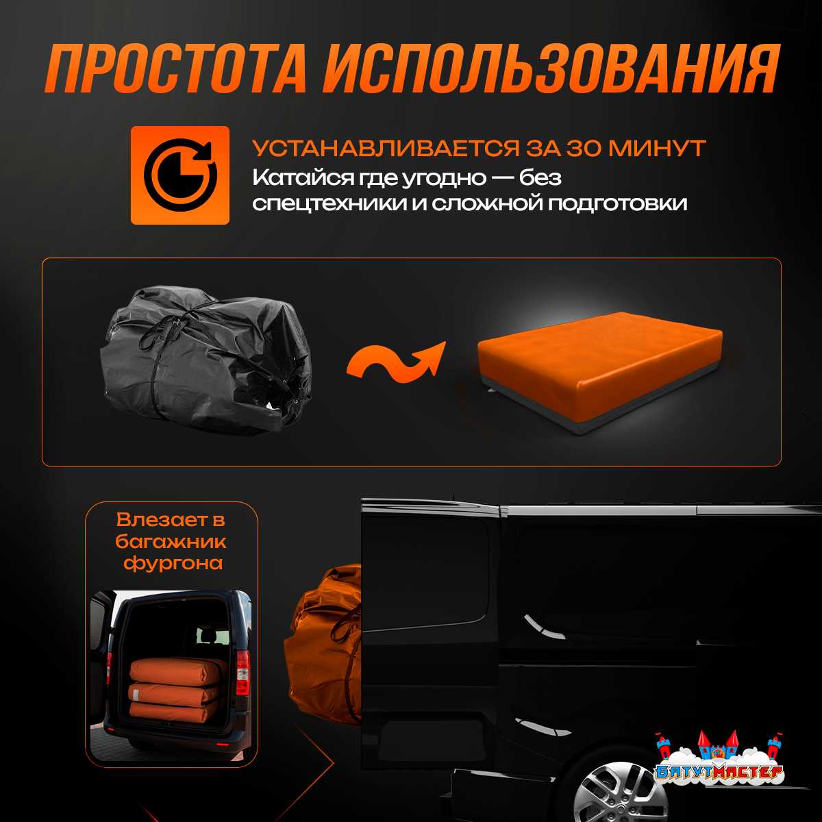- Подушка в сложенном виде легко помещается в багажник фургона и транспортируется на любые площадки.