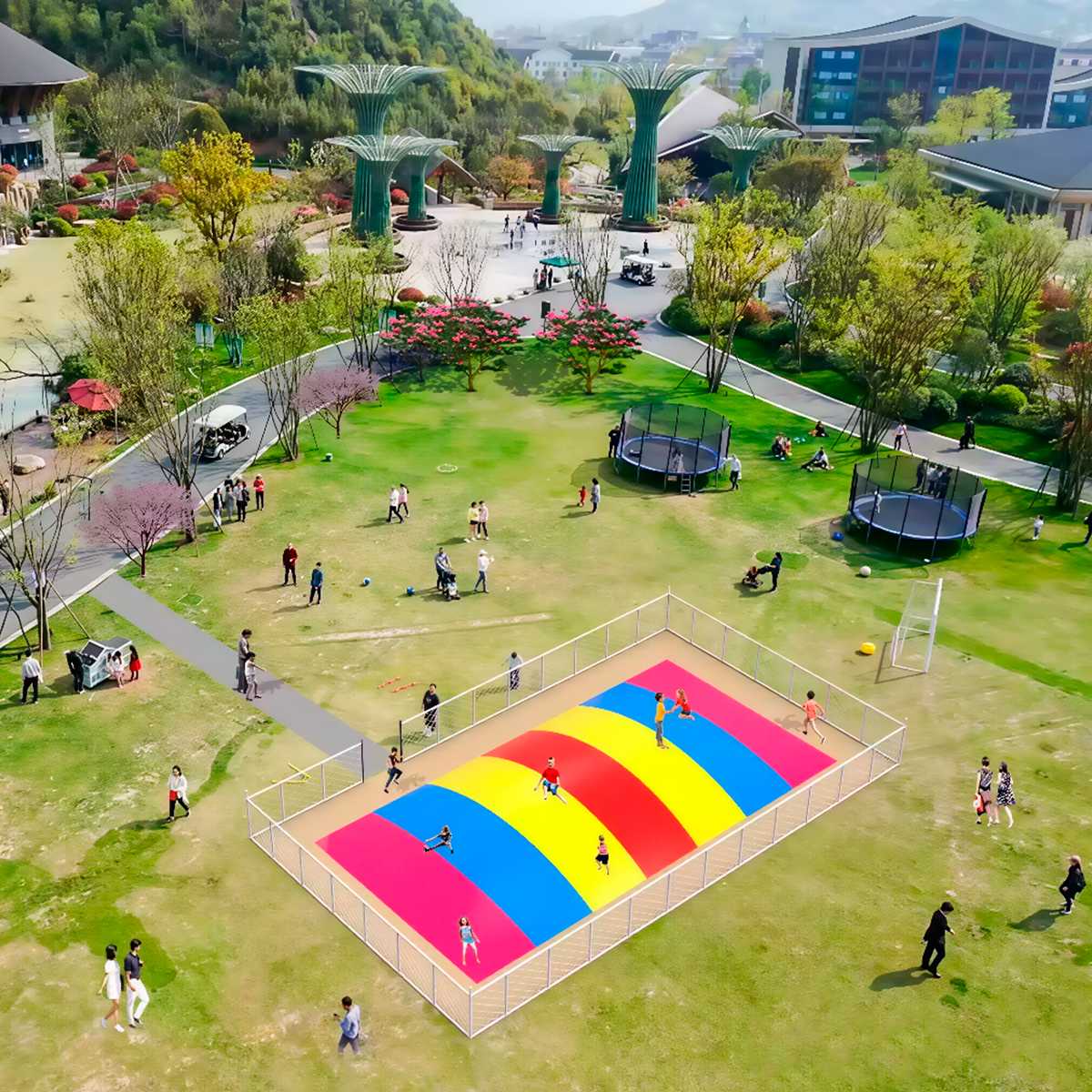Представьте, как дети с восторгом прыгают на огромной подушке, а родители с удовольствием наблюдают за этим с лавочек поблизости. Пространство сразу оживает и наполняется энергией — именно это запоминается и побуждает вернуться снова.