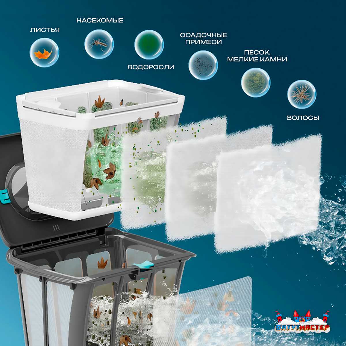 - Абсолютная чистота — устройство удаляет не только крупный мусор, но и песок, водоросли и налёт.