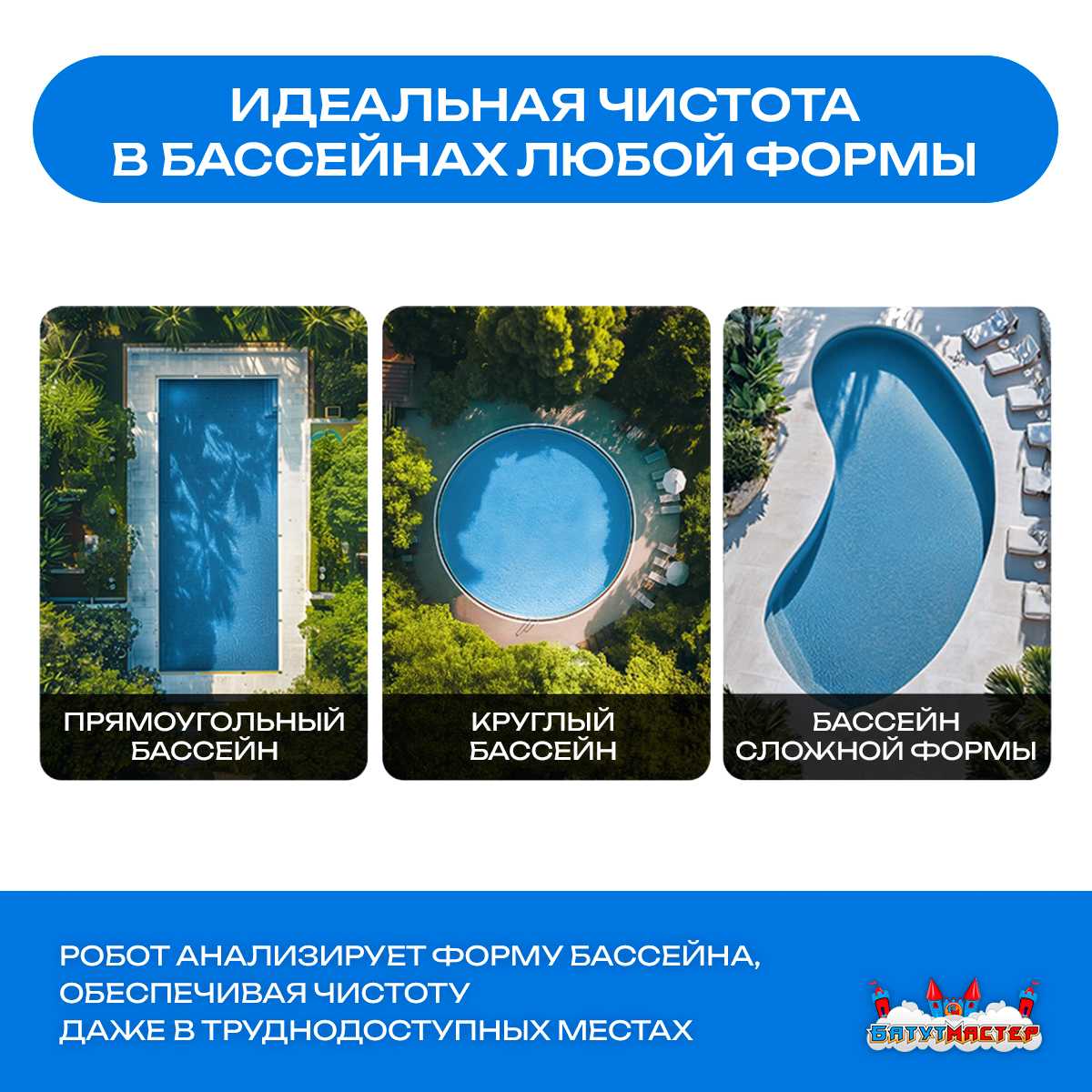 - Универсальность — подходит для бассейнов любой формы: круглых, прямоугольных, сложных.