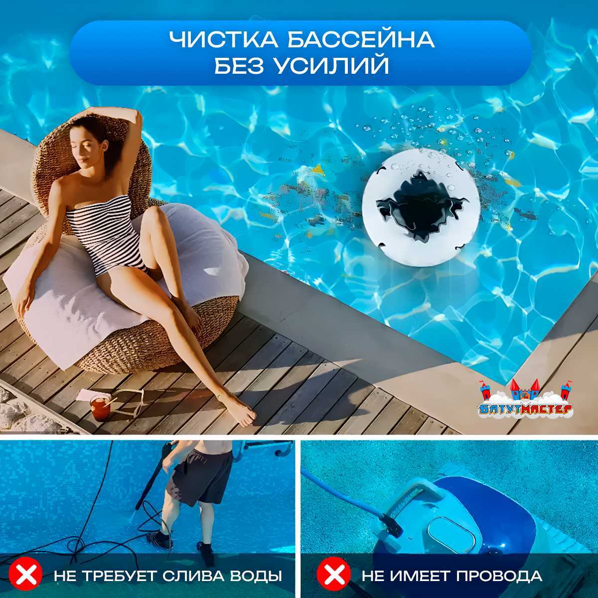 Беспроводная конструкция позволяет роботу свободно перемещаться по всей поверхности бассейна, не путаясь в кабелях и не ограничивая радиус действия.