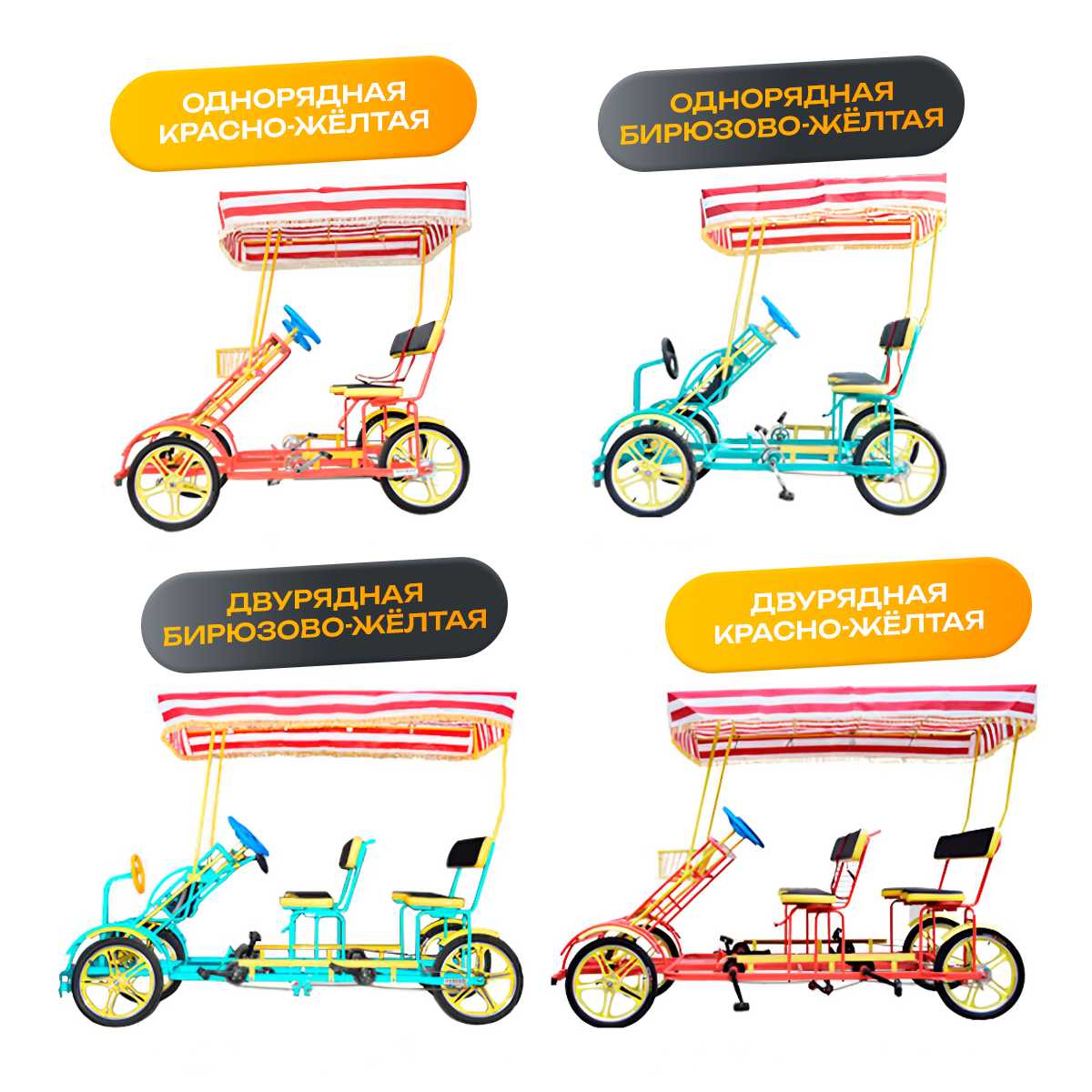 Особое внимание заслуживает внешний вид модели. Яркая бирюзовая рама с желтыми вставками выделяется в любом окружении, а полосатый тент защищает пассажиров от палящего солнца и легкого дождя. Такая комбинация цветов и форм делает веломобиль не только удобным, но и привлекательным элементом прогулочной зоны.