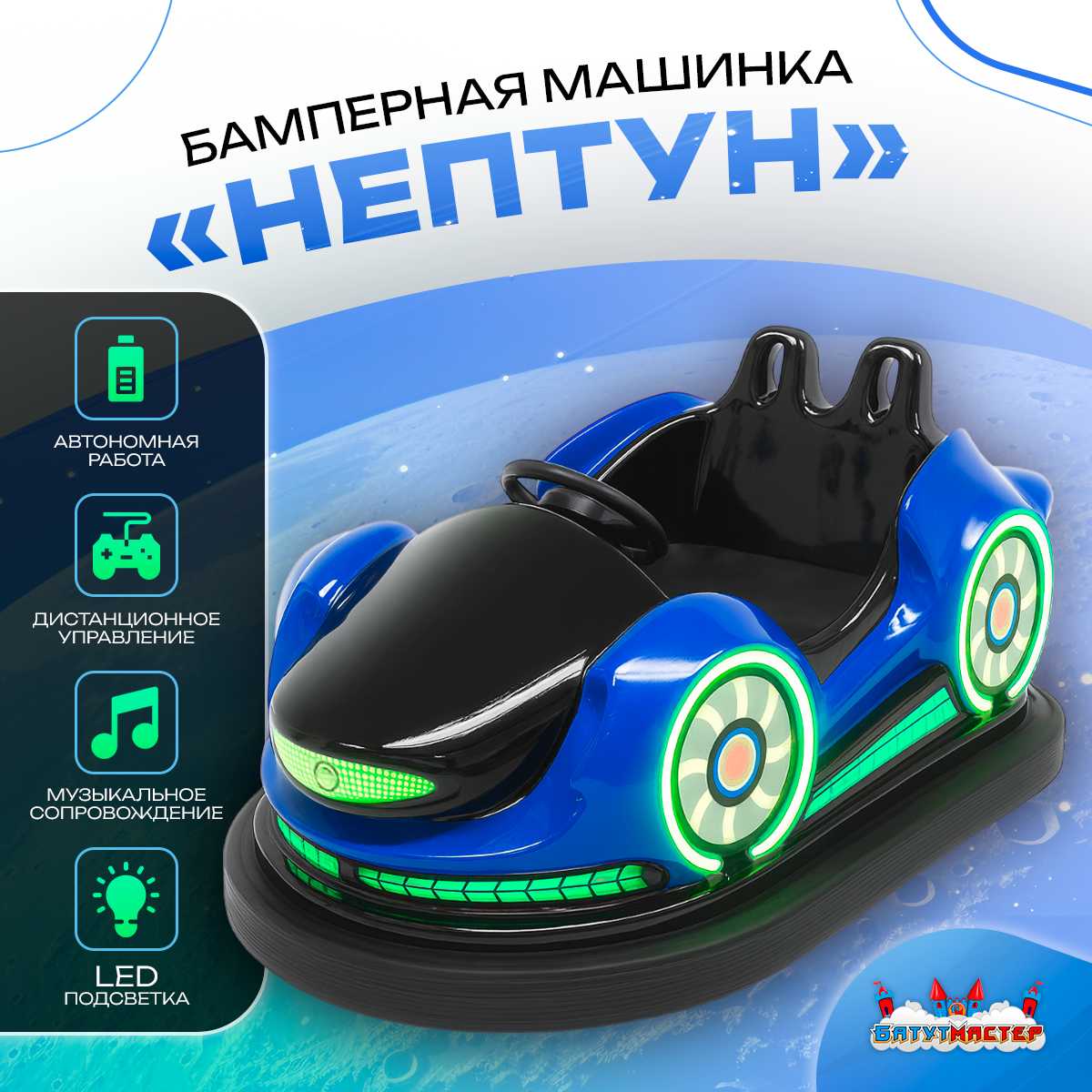 Бамперная машинка «Нептун» — это современный аттракцион нового поколения, созданный для ярких эмоций и безопасного отдыха детей и взрослых. Она сочетает в себе стильный дизайн, прочную конструкцию и современные технологии: яркую LED-подсветку, музыкальное сопровождение и дистанционное управление.