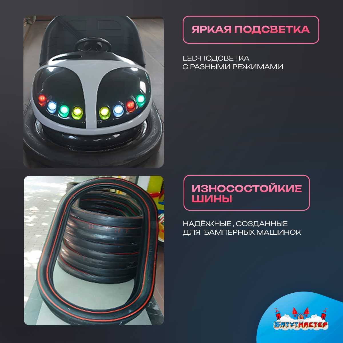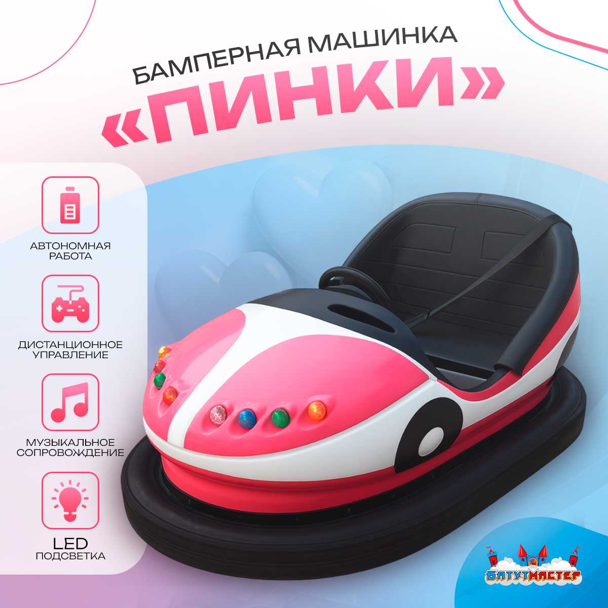 Бамперная машинка «Пинки» — это идеальный выбор! Яркий дизайн привлекает внимание, надёжная конструкция гарантирует долговечность, а LED-подсветка и музыка создают неповторимую атмосферу праздника.