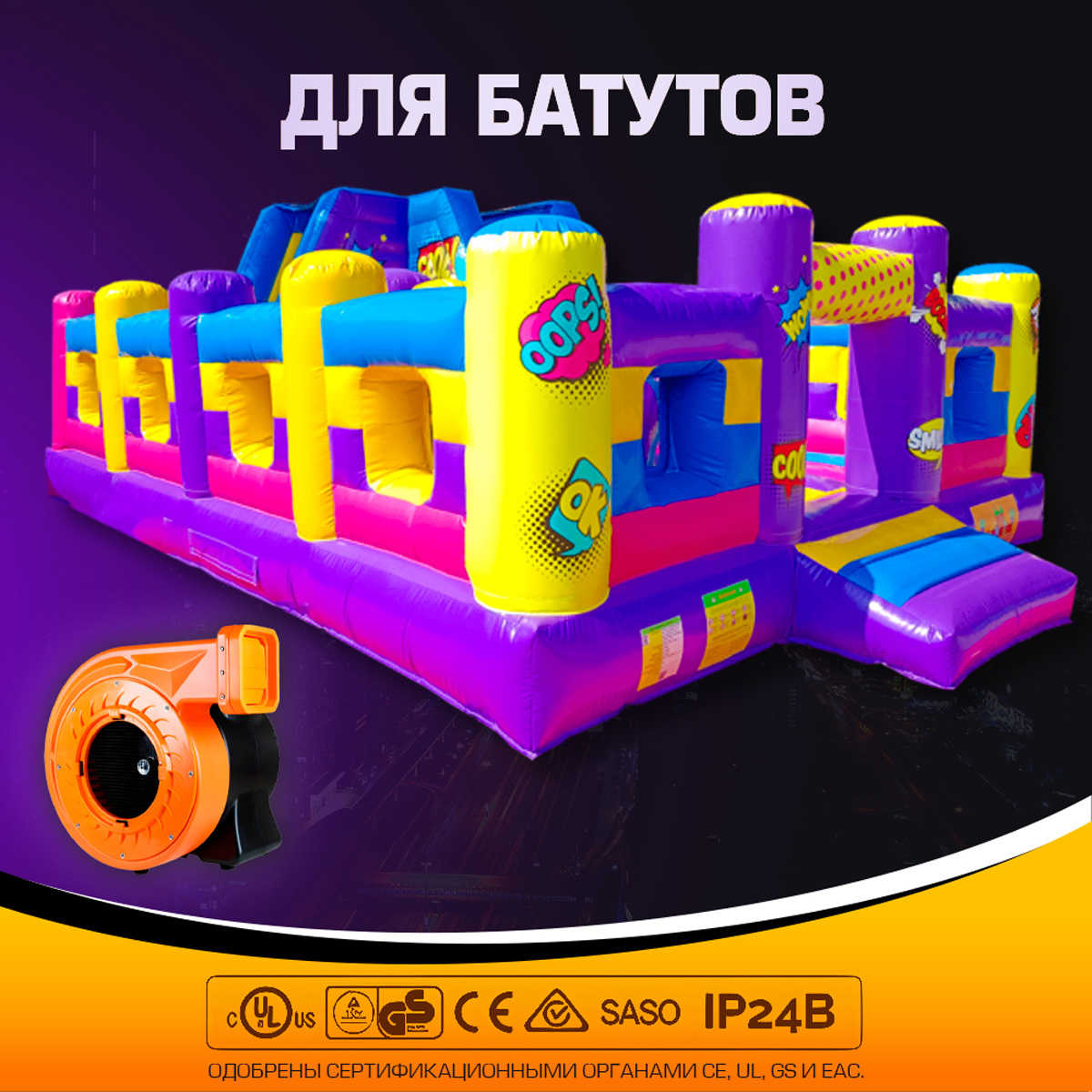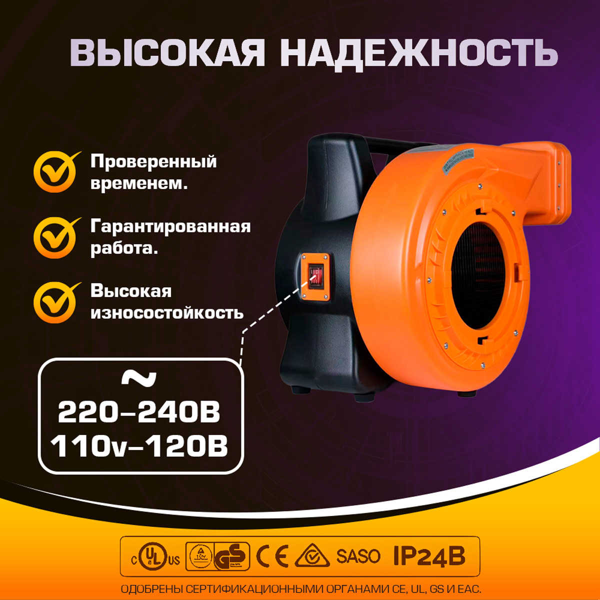 Мощность устройства позволяет всего за несколько минут наполнить воздухом даже крупные аттракционы площадью до 25 м².