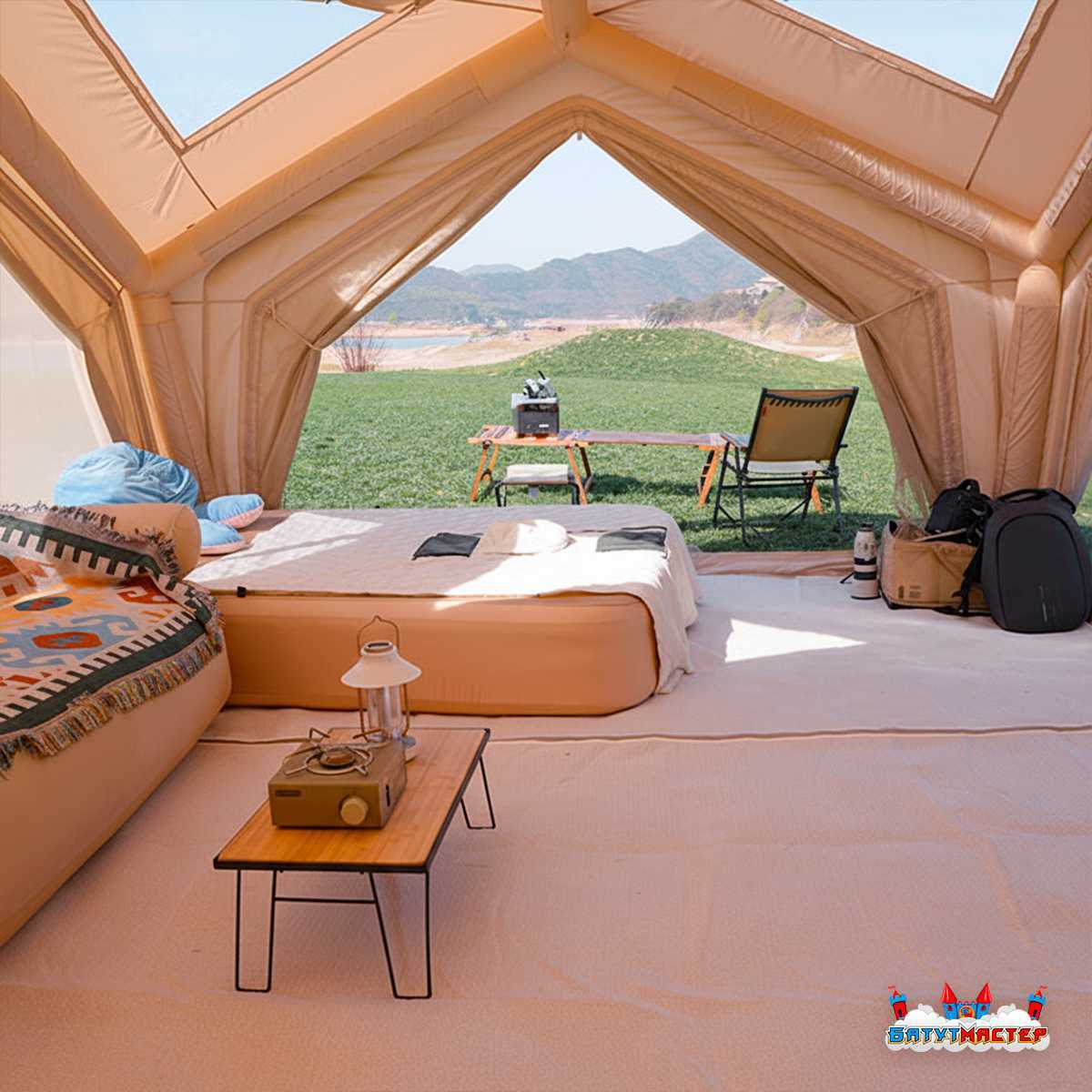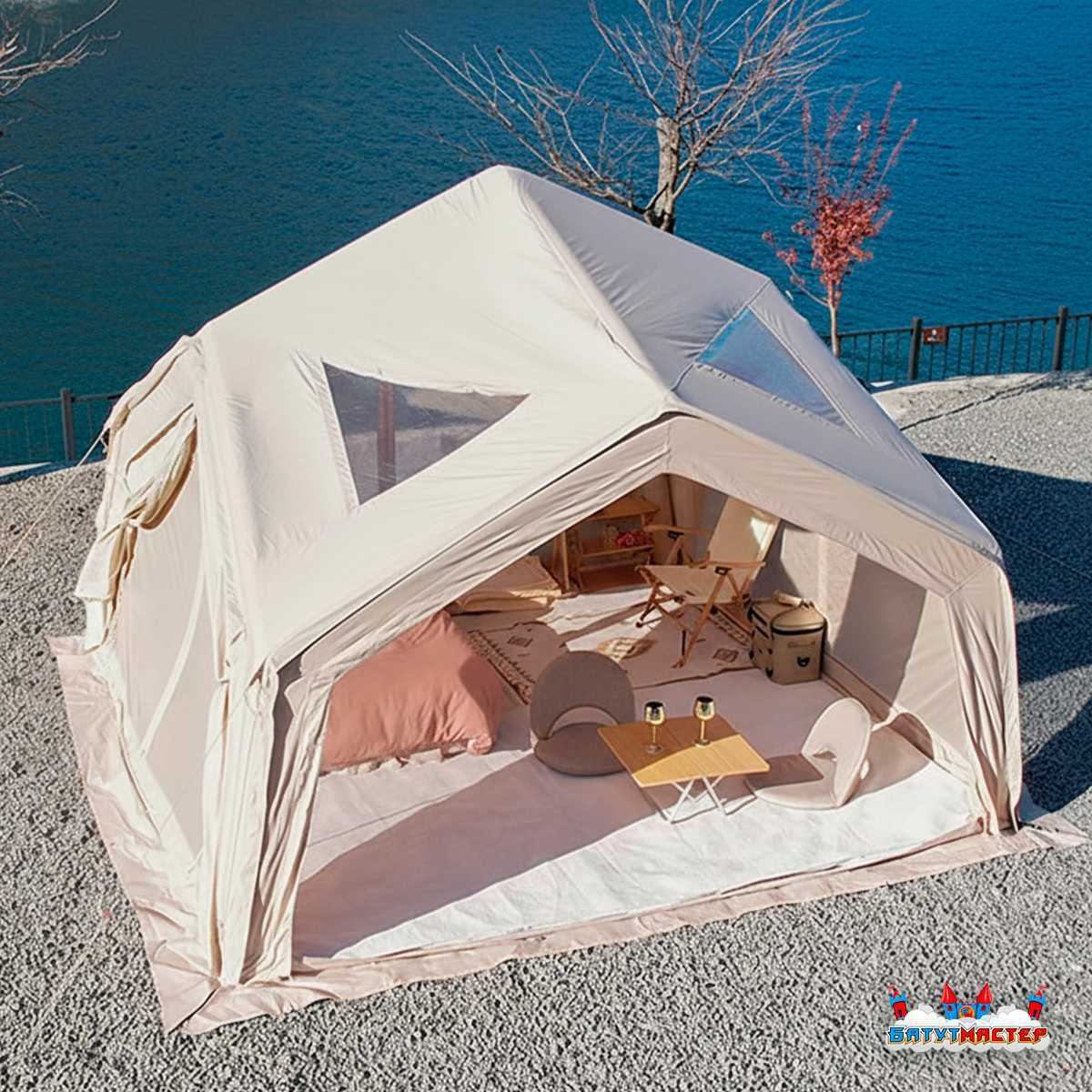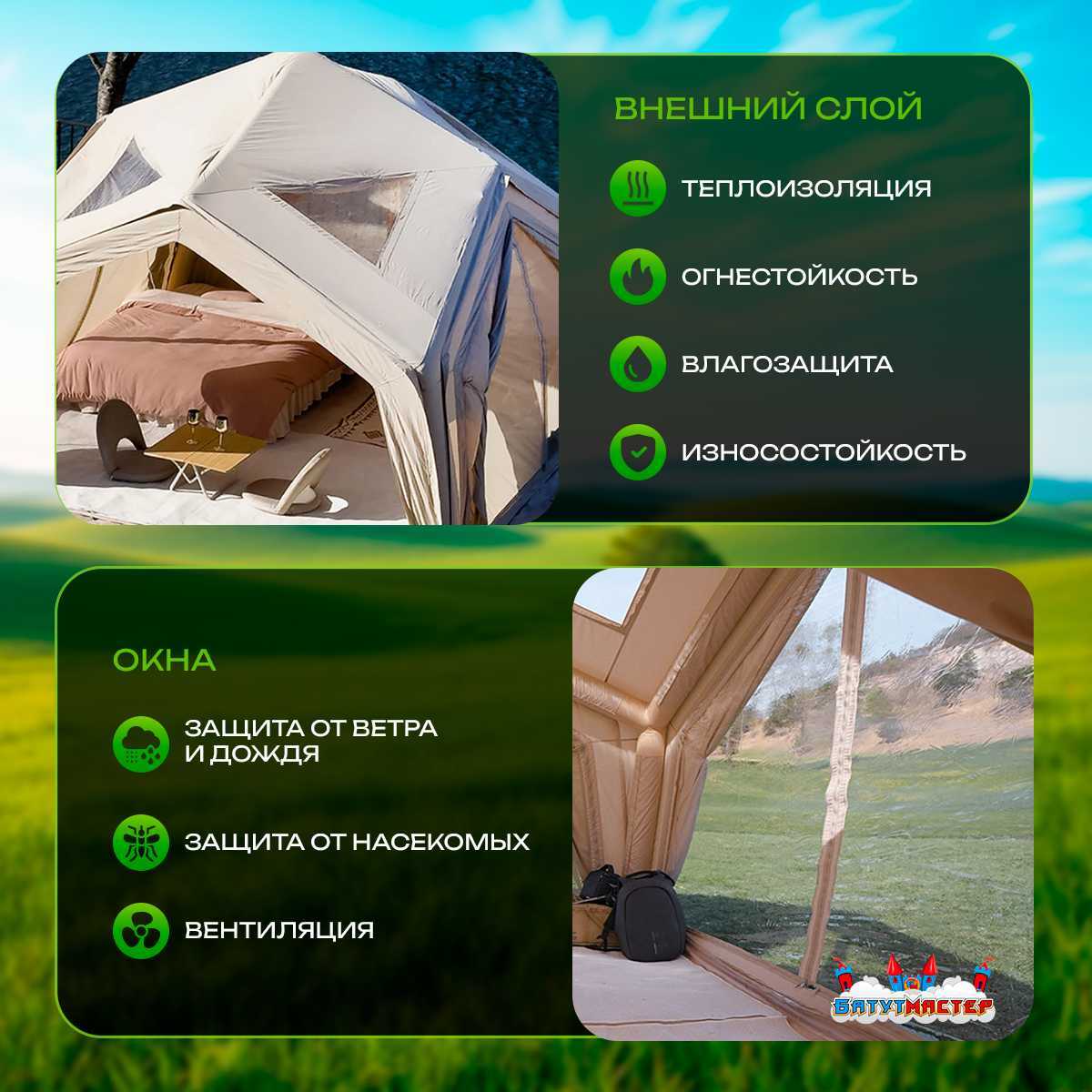 Палатка устойчива к ветру и влаге, сохраняет микроклимат и комфорт даже при длительных выездах. Окна обеспечивают естественное освещение и вентиляцию, москитные сетки защищают от насекомых. Материалы рассчитаны на использование в условиях активного туризма и не теряют прочности со временем.
