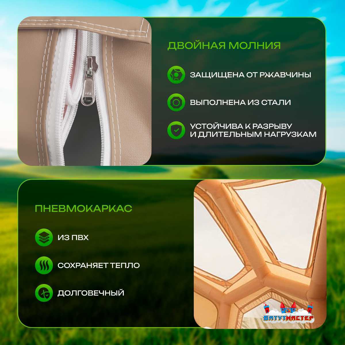 Летние пневмокаркасные палатки становятся всё более востребованными среди туристов, путешественников и владельцев кемпинг-бизнеса. Модель «Летний Уют» — это современное решение, которое сочетает практичность, долговечность и удобство. Благодаря просторным размерам 3.8x3.8x2.5 м внутри можно разместить несколько спальных мест и обустроить зону для отдыха.