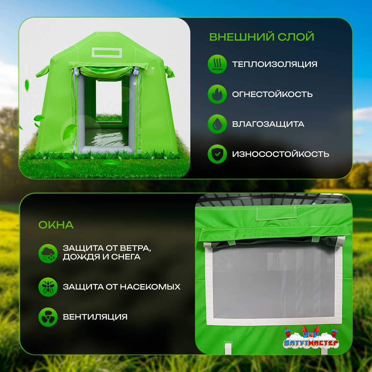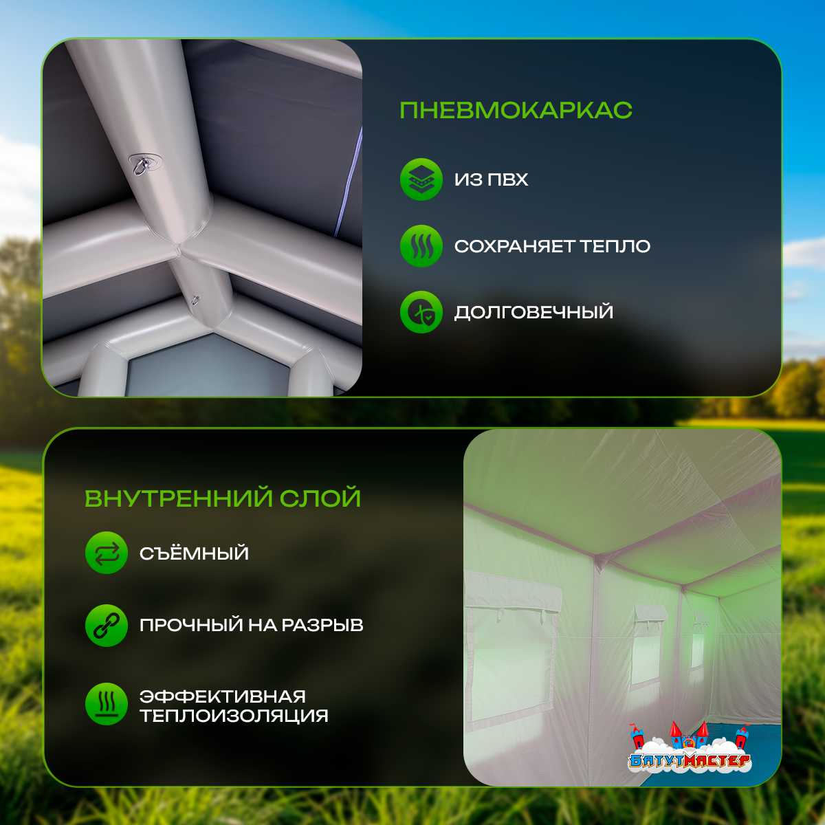Пневмокаркасная палатка "Универсал" зелёного цвета 4x2.5x2.5 — это современное решение для создания комфортного пространства в любых условиях. Она успешно используется как для отдыха на природе, так и для профессиональных задач в бизнесе. Простота сборки, устойчивость к погодным условиям и универсальность применения делают её востребованной во множестве сфер.