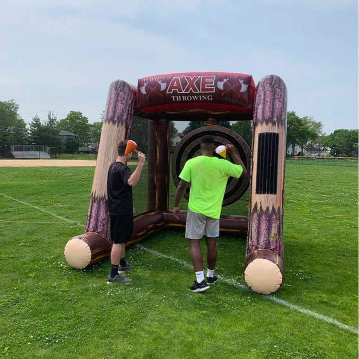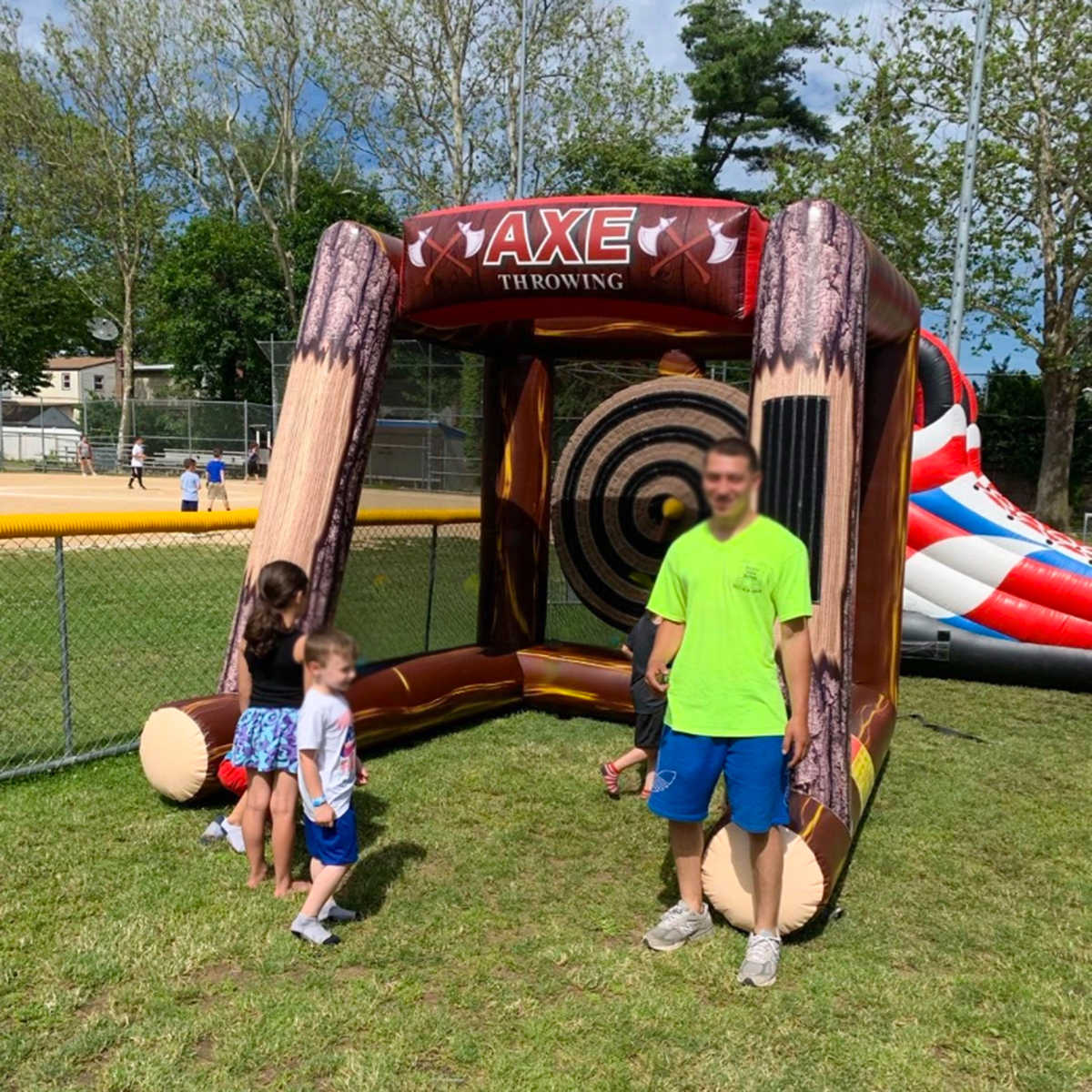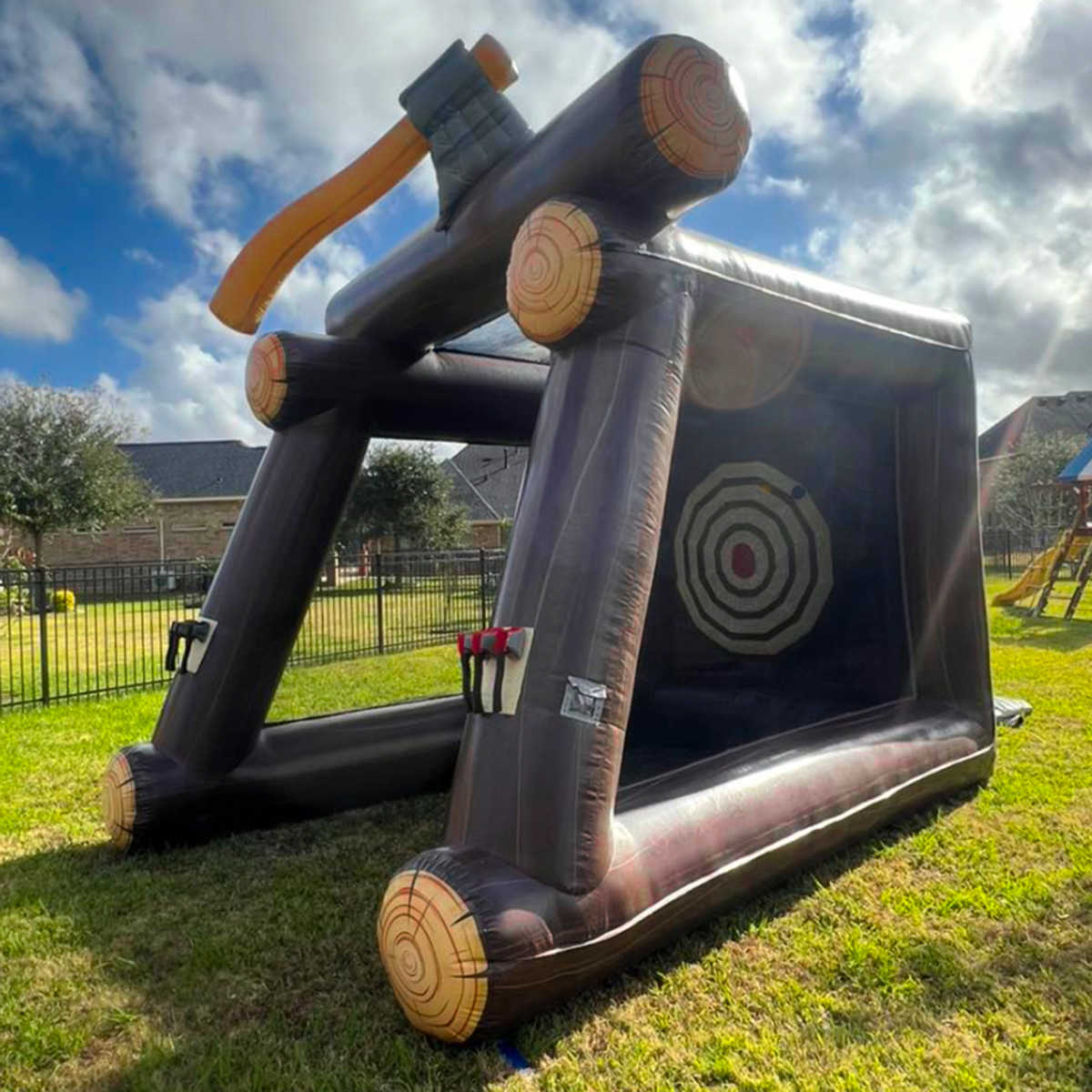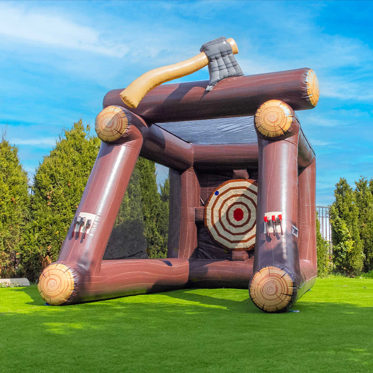 Надувной герметичный дартс «Меткий топор» 4×3×4 м с мишенью диаметром 4 м — это зрелищный и оригинальный аттракцион, сочетающий азарт, силу и точность. Дартс тематическом дизайне “лесной арены” с имитацией дерева и гигантским топором, вонзённым в верхнюю балку конструкции.