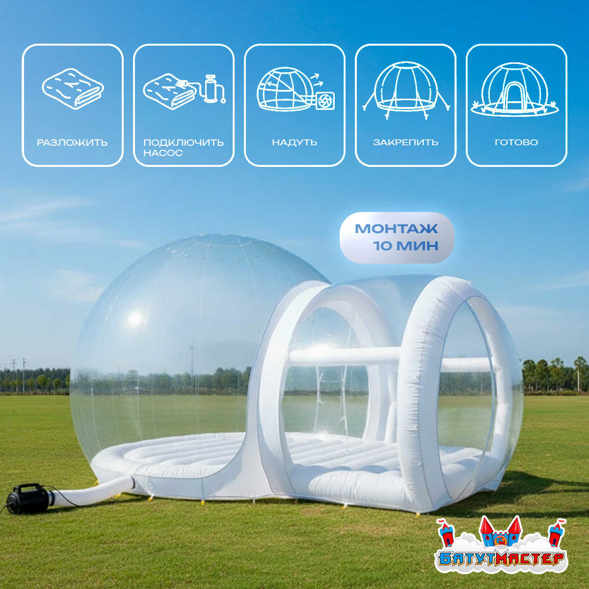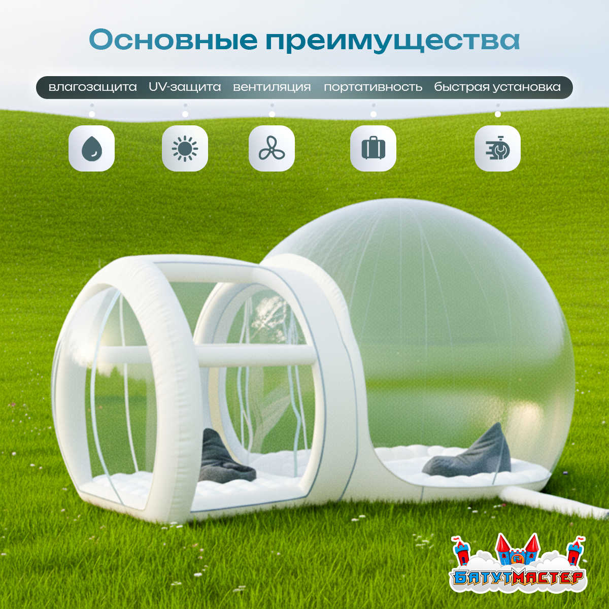 Надувная палатка-шар «BubbleTrees» ПВХ с надувным дном 4×3×2,8 м — это воплощение гармонии с природой и современных технологий. Он создан для тех, кто хочет наслаждаться открытым небом, при этом не жертвуя комфортом. Прозрачные стены шара позволяют наблюдать закаты, звёзды и окружающий пейзаж, оставаясь в уютной и защищённой зоне.