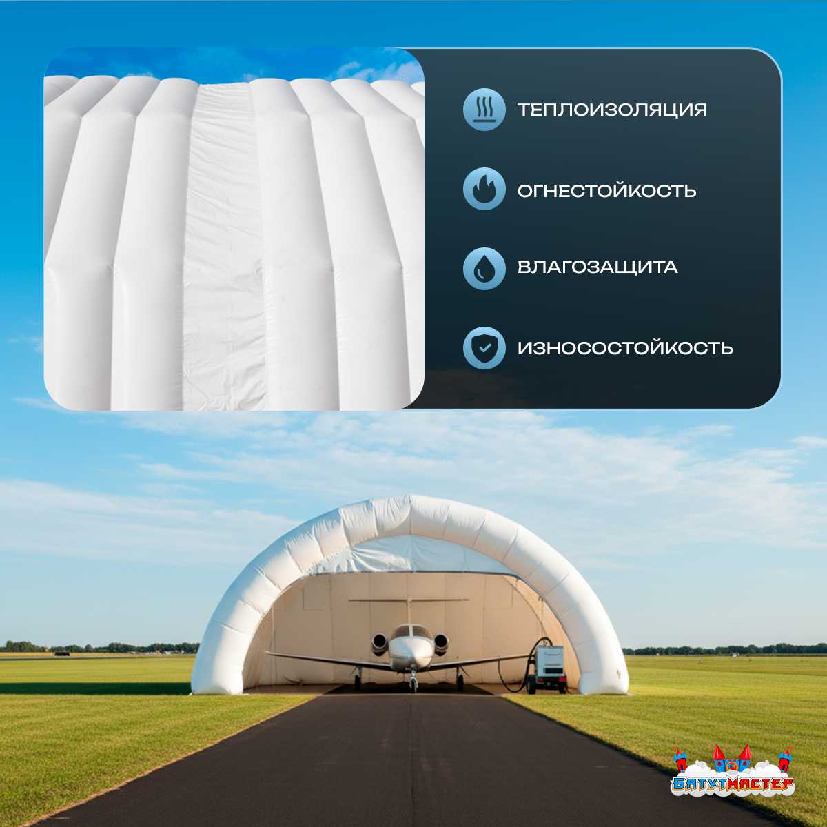 Такая технология позволяет отказаться от тяжёлых металлических каркасов и сократить время монтажа до минимума — ангар готов к использованию уже через несколько часов после доставки на площадку. Несмотря на лёгкость он способен выдерживать сильные ветровые и снеговые нагрузки, сохраняя герметичность и форму даже в суровых климатических условиях.