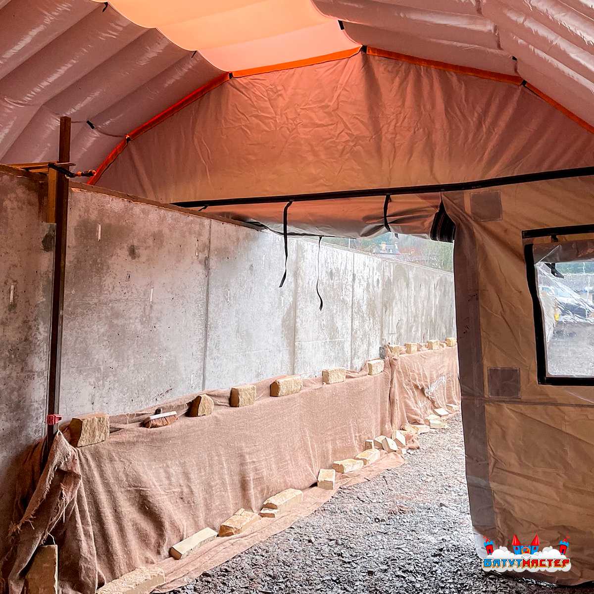 Монтаж ангара «Рубеж» занимает минимальное время и не требует сложных подготовительных работ. Его можно разместить на любом твёрдом основании — асфальте, бетоне или грунте. Крепление выполняется при помощи ремней и анкерных систем, а по периметру устанавливаются утяжелители для устойчивости.