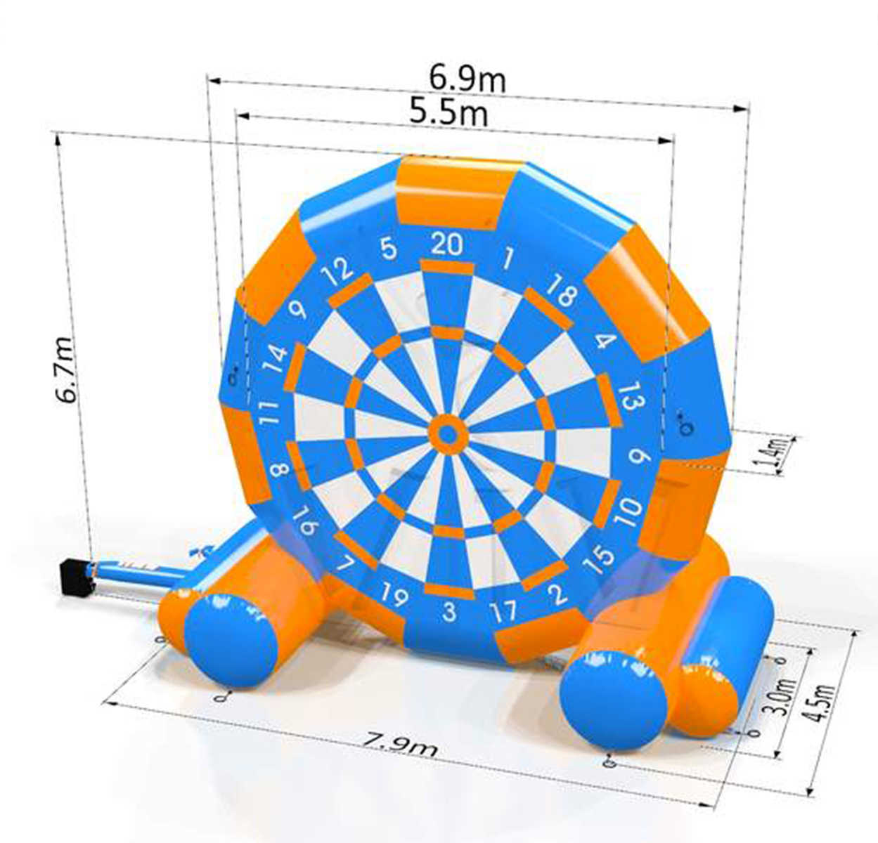 Надувной футбольный дартс «Гранд» — это чемпион в мире аттракционов меткости и развлечений. Дартс поражает своими размерами: диаметр мишени — 6,9 метра, а высота конструкции — 6,7 м. Идеален для масштабных мероприятий, где важно привлечь внимание зрителей и создать вау-эффект с первой секунды! Игроки соревнуются, забивая мягкие липучие мячи в сектора мишени, набирая очки за точность. Формат игры подходит для детей, взрослых и целых команд — веселье и эмоции гарантированы!