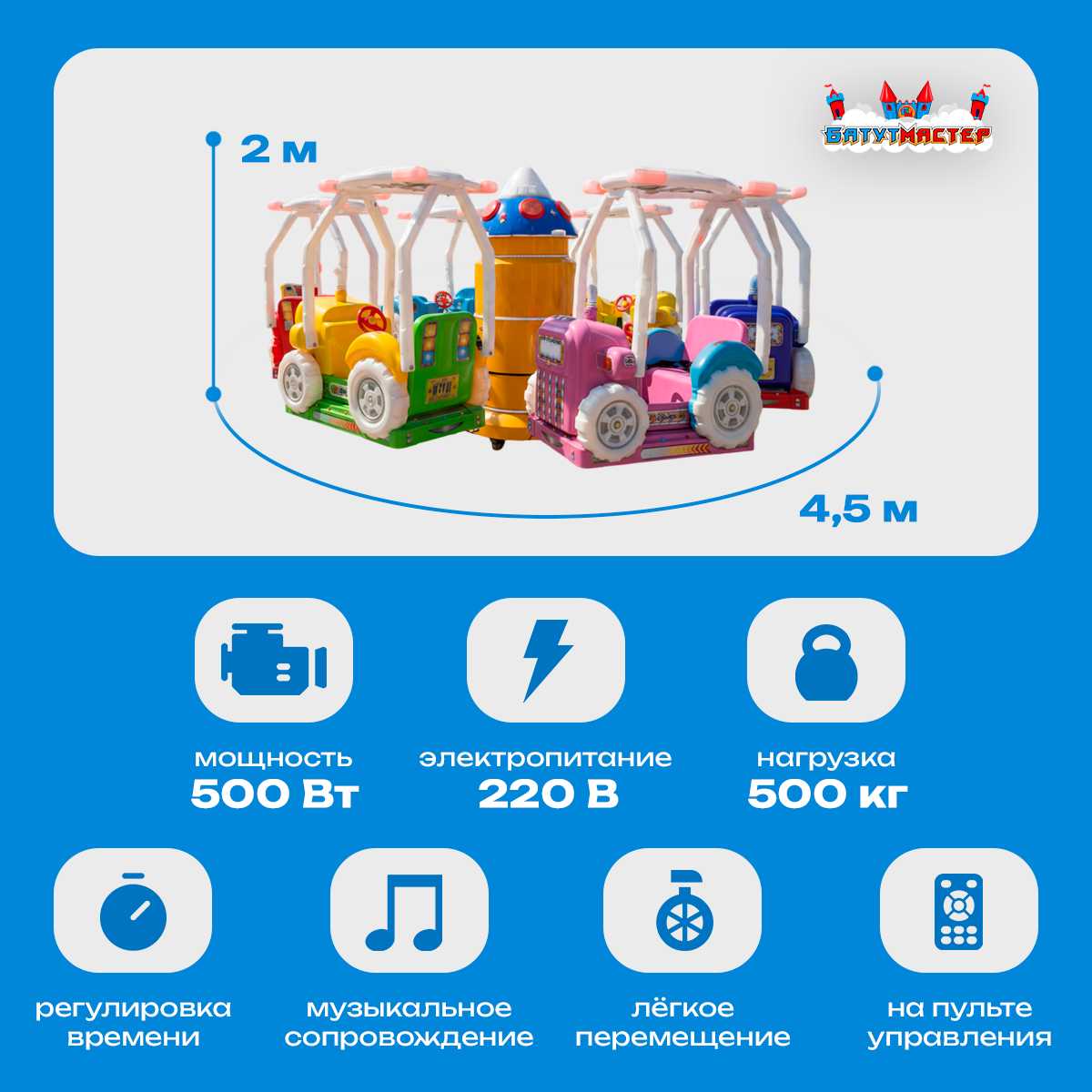 Электрическая карусель «Автокарусель» 4,5×4,5×2 м — это профессиональный аттракцион нового поколения, созданный для сферы развлечений и бизнеса. Она сочетает эстетическую привлекательность и технологическую надёжность, обеспечивая безопасное и эффектное катание для детей и взрослых.