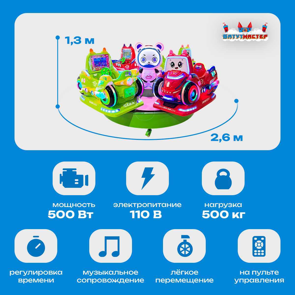 Электрическая карусель «Карусель машинок» 2,6×2,6×1,3 м — компактный и невероятно яркий аттракцион для малышей, который объединяет динамику, свет и музыку.