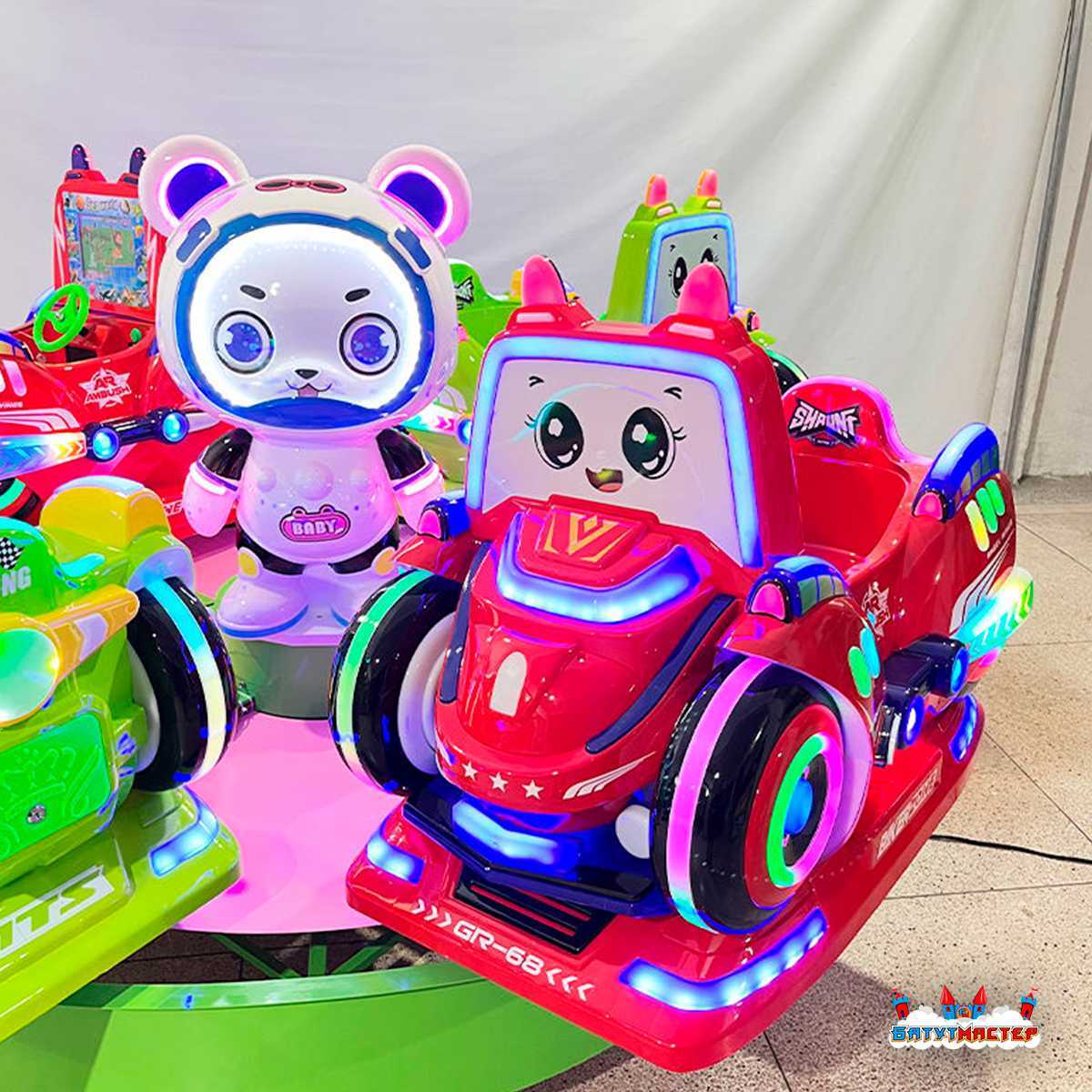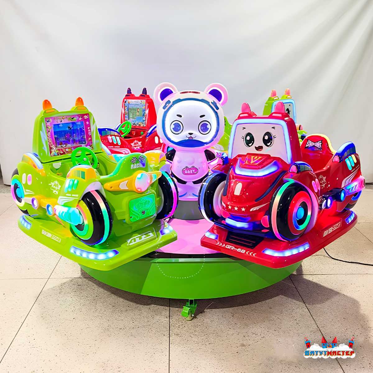 Малыши с радостью садятся за руль своих забавных машинок, музыка звучит, огни мигают — и всё вокруг оживает от смеха и восторга.