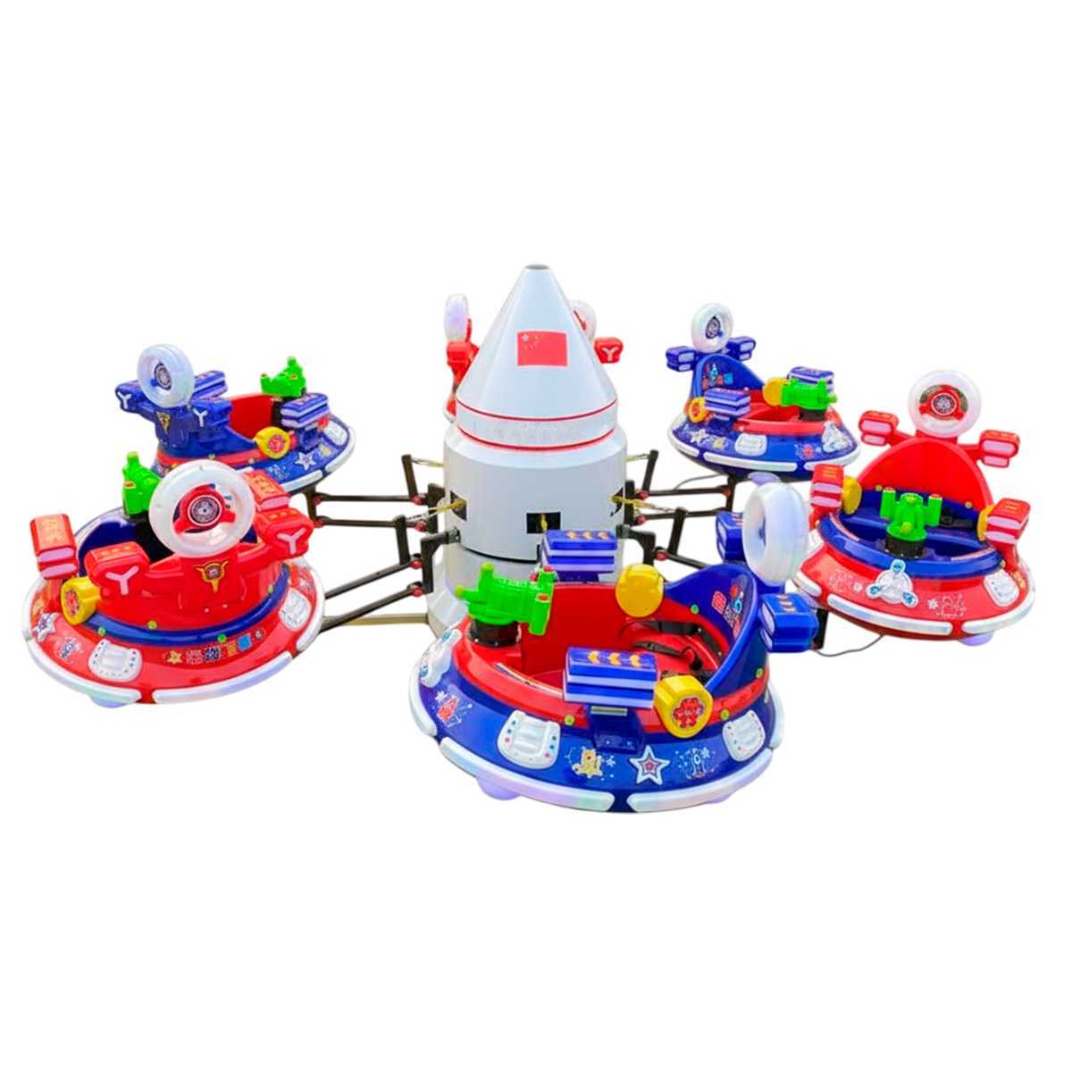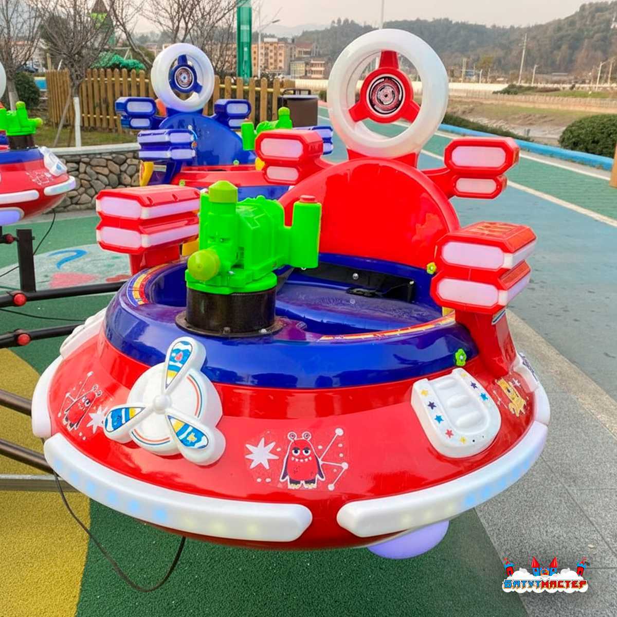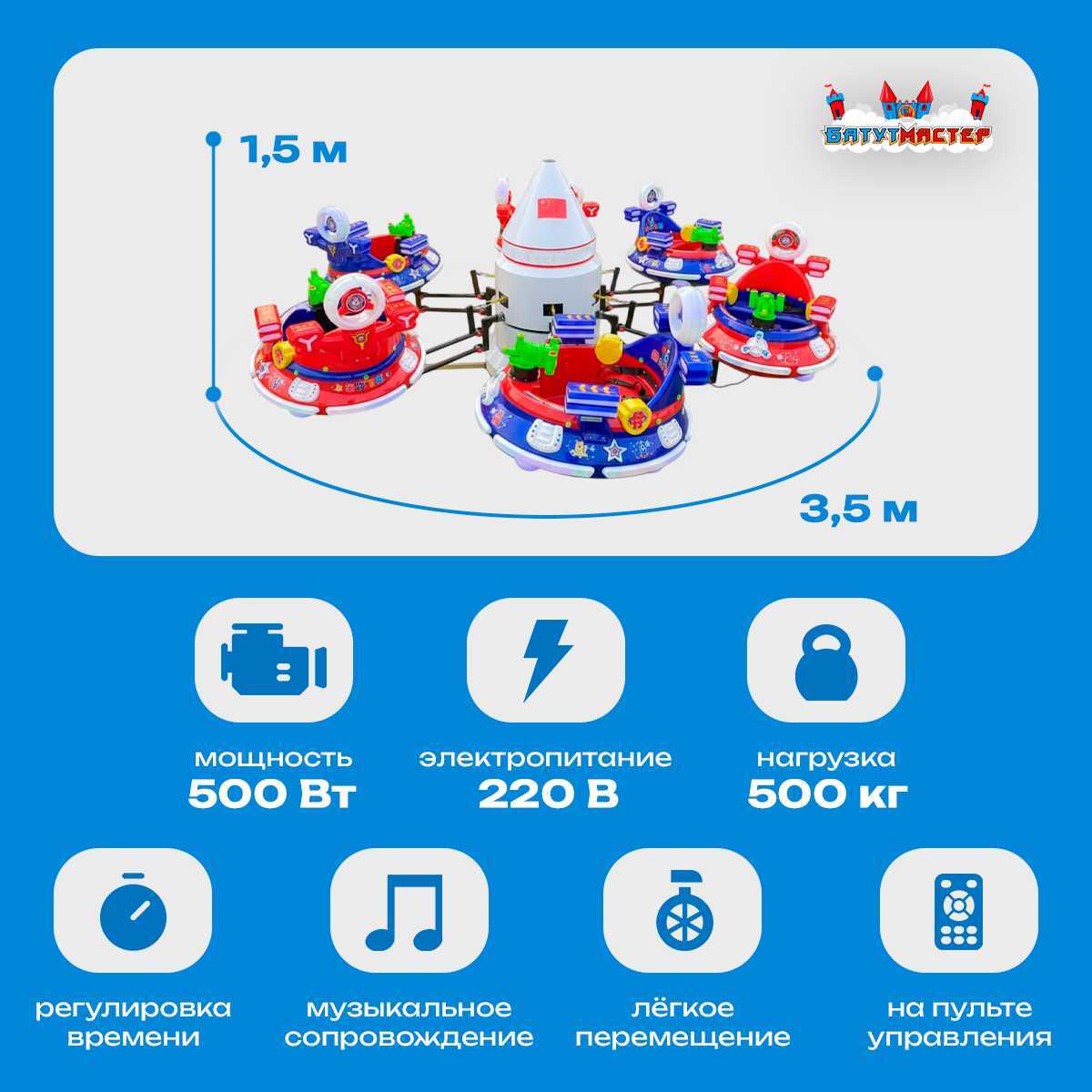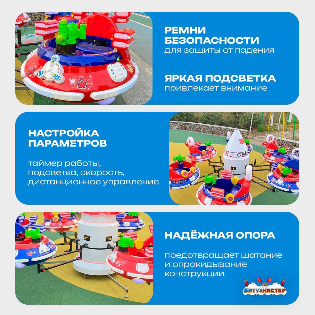 «Космическое приключение» 3.5x3.5x1.5 м — это миниатюрная, но эффектная детская электрическая карусель в тематике космоса. Центральная башня выполнена в форме ракеты, а вокруг неё вращаются кабины в виде летающих тарелок с сиденьями, штурвалами и элементами игры.