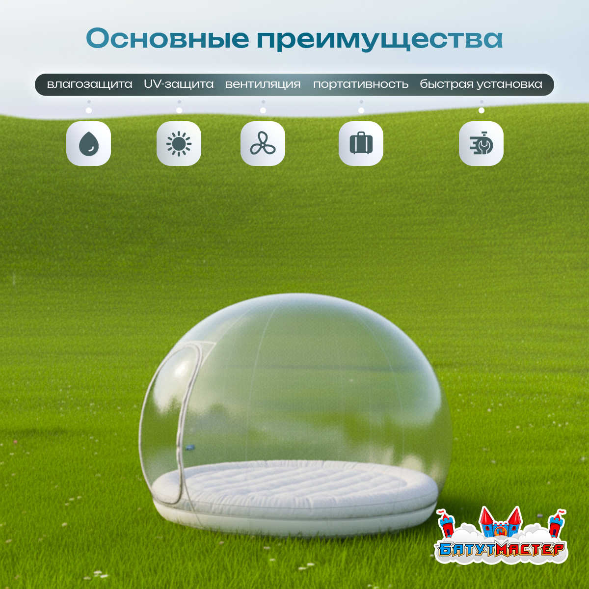 Надувной купол «BubbleTrees» ТПУ с надувным дном 4×4×3 м — это инновационное решение для отдыха и бизнеса, где сочетаются прозрачность, стиль и продуманная функциональность. Купол создан для тех, кто ценит эстетику и комфорт: вы видите звёзды, снежный пейзаж или зелёную долину, при этом находитесь в тепле и уюте.