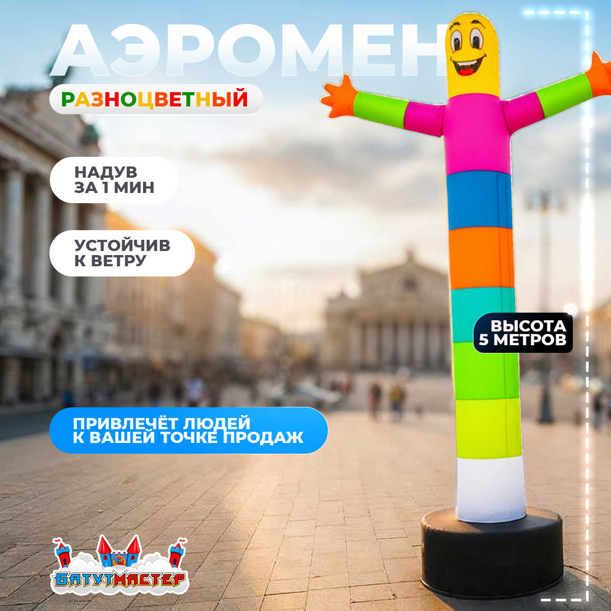 Аэромен «Разноцветный» 5 метров — это не просто реклама, а весёлый артист, который работает за вас 24/7. Он приглашает, привлекает и делает ваш бренд заметным среди всех.