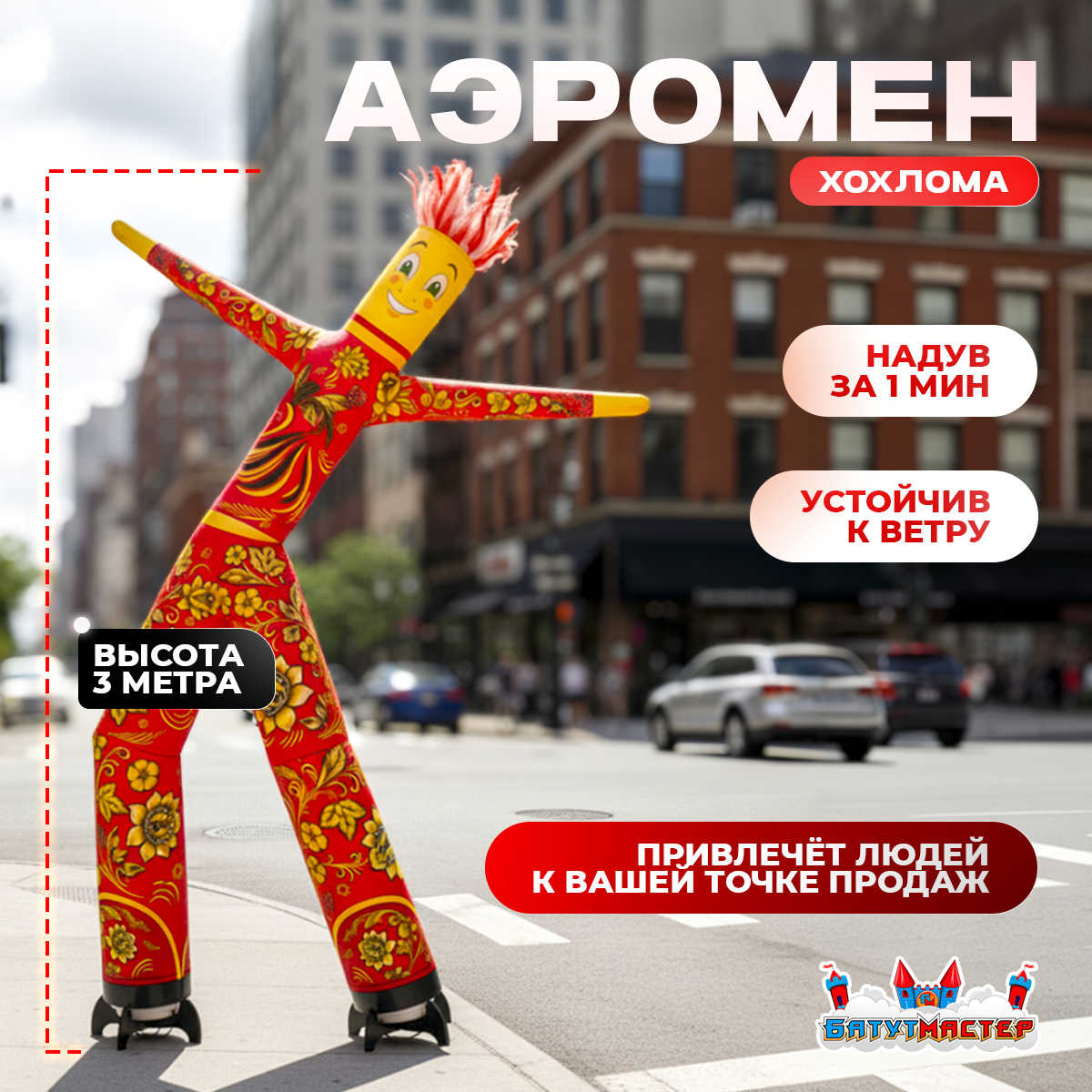 Аэромен «Огненная Хохлома» 3 м — это не просто реклама, а яркий элемент, наполняющий улицу теплом и радостью! Он притягивает взгляды, создаёт настроение и делает вашу точку притяжением внимания.