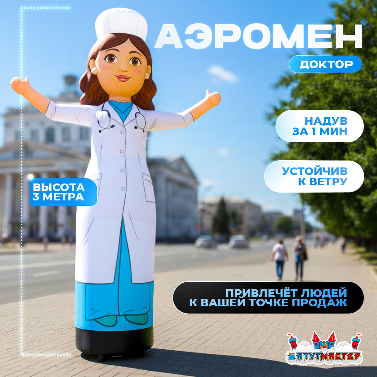 Аэромен «Доктор» — это не просто реклама, а тёплое приветствие каждому прохожему. Он создаёт доверие, привлекает клиентов и вызывает улыбку.