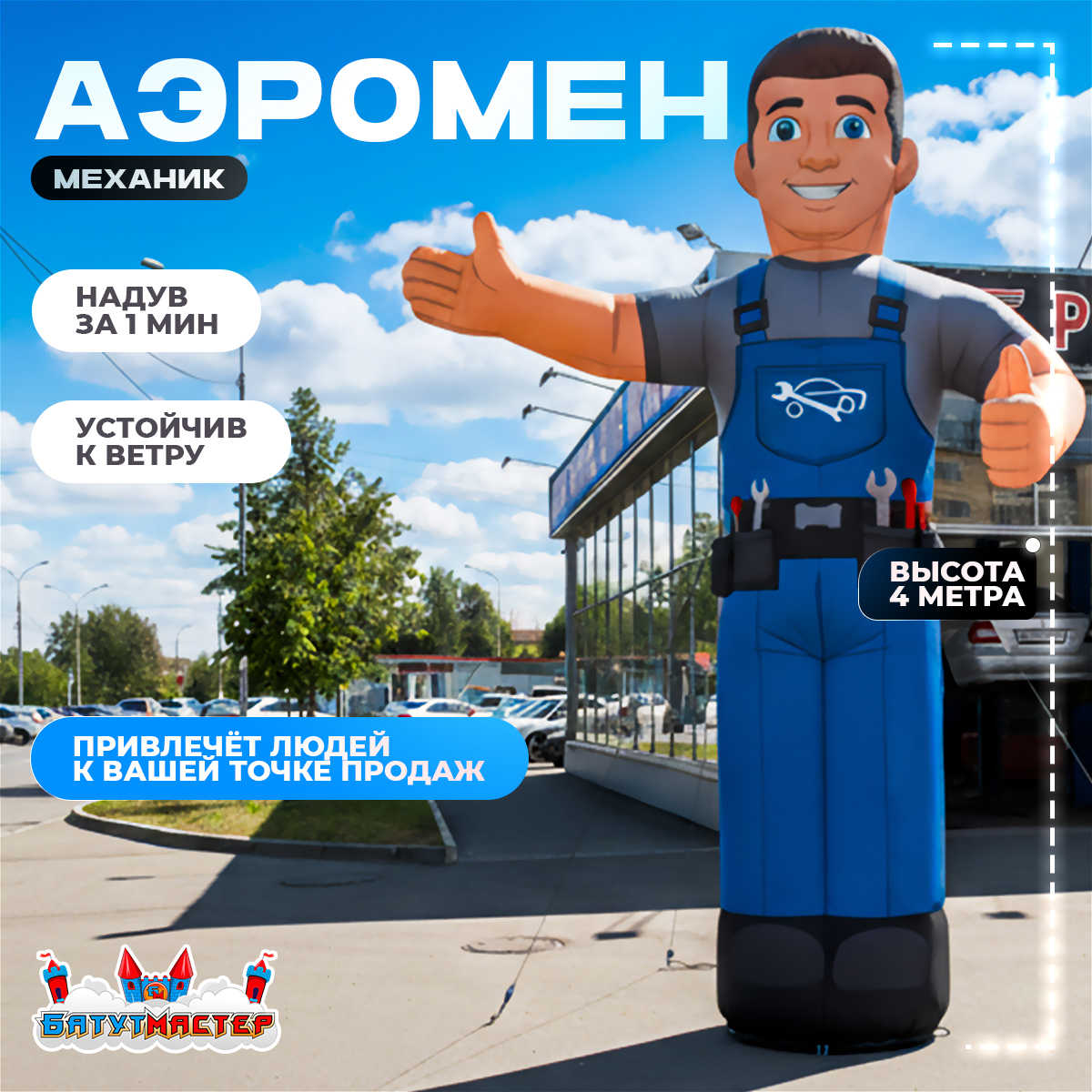 Аэромен «Механик автосервиса» с машущей рукой — это не просто реклама, а живой символ доверия и профессионализма. Он оживляет вашу площадку, притягивает внимание и превращает обычный автосервис в место, которое запоминают.