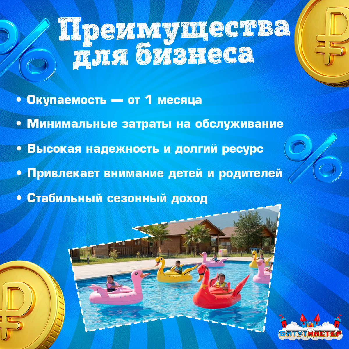 Благодаря высокой популярности среди детей, лодки быстро окупаются и приносят стабильную прибыль.