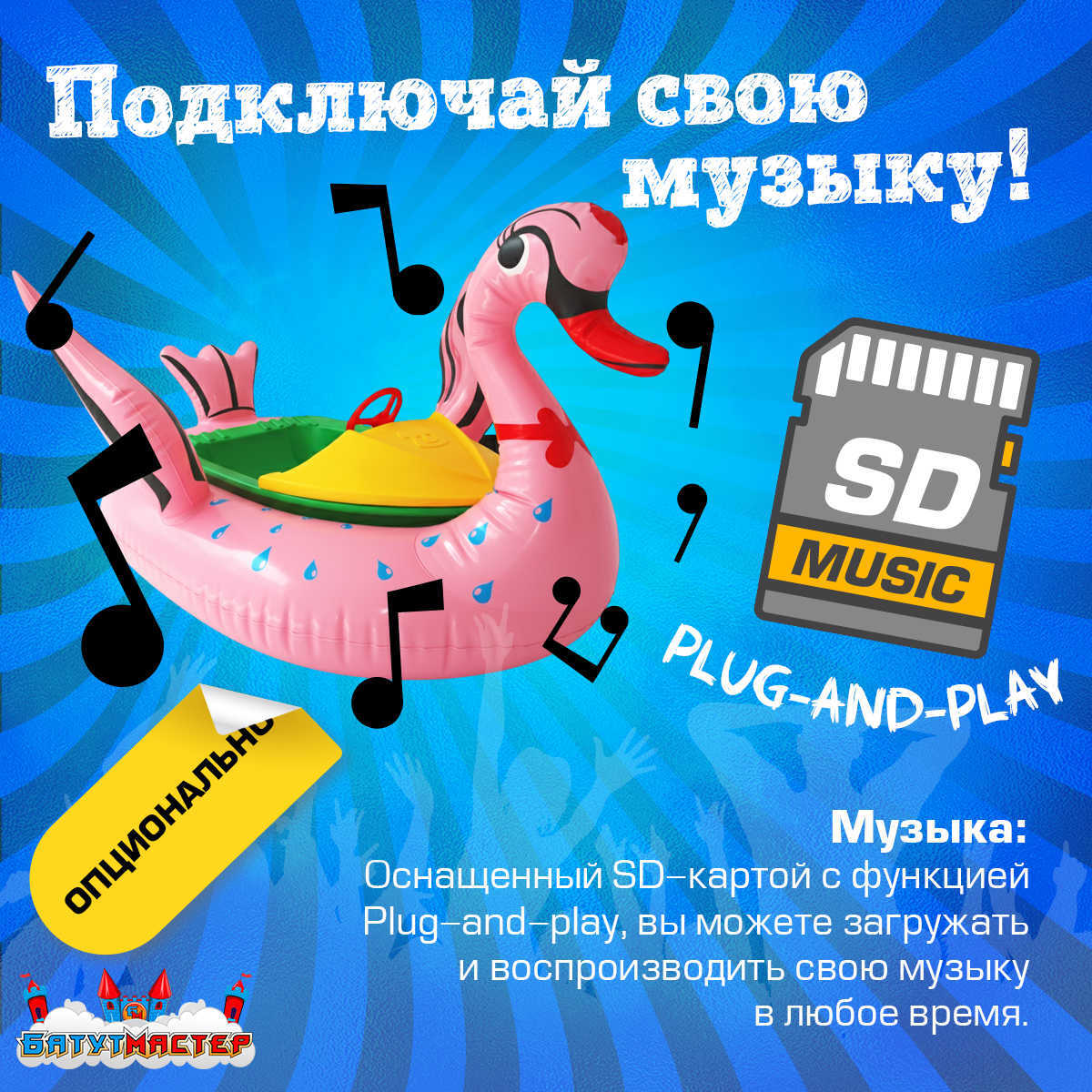 Дополнительно лодка оснащена музыкальным модулем с SD-картой, позволяющим воспроизводить музыку во время катания. Это создаёт праздничную атмосферу и делает аттракцион ещё более привлекательным для детей.