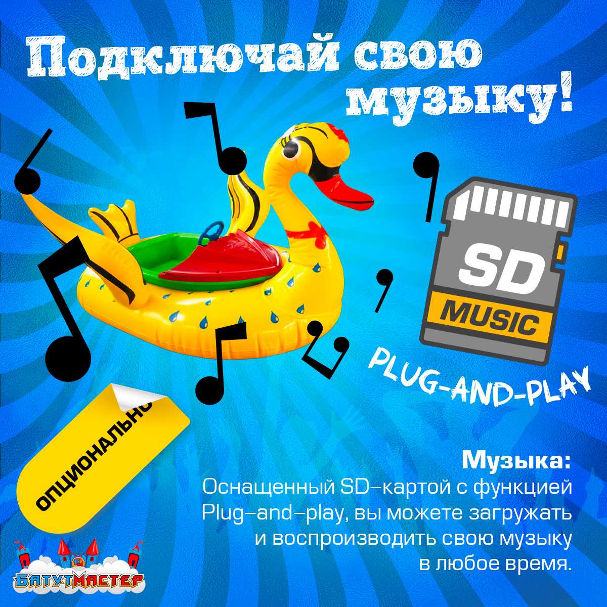 Дополнительно лодка оснащена музыкальным модулем с SD-картой, позволяющим воспроизводить музыку во время катания. Это создаёт праздничную атмосферу и делает аттракцион ещё более привлекательным для детей.