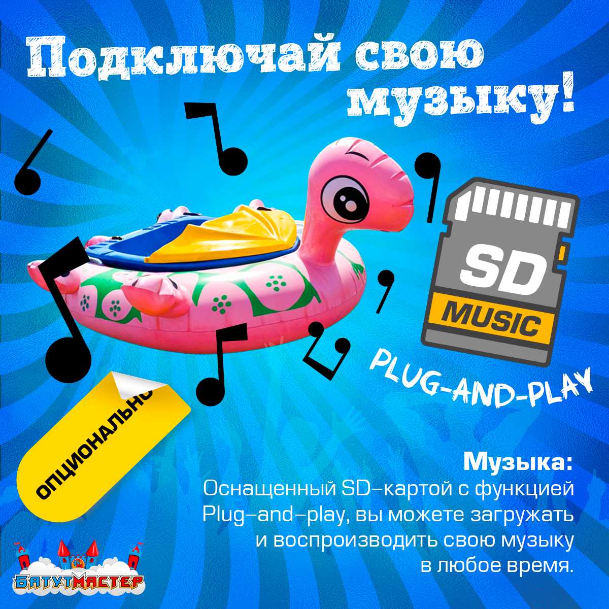 Дополнительно лодка оснащена музыкальным модулем с SD-картой, позволяющим воспроизводить музыку во время катания. Это создаёт праздничную атмосферу и делает аттракцион ещё более привлекательным для детей.