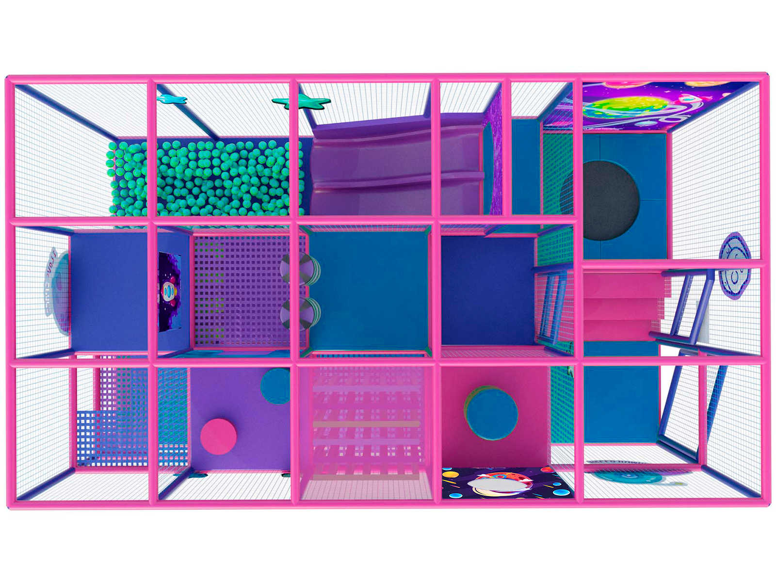 Двухуровневая конструкция размерами 6,5×2,46×3,2 м уместилась в компактный корпус, который легко впишется в зону любого ТРЦ или игровую комнату. Несмотря на размеры, маршрут насыщен и спланирован так, чтобы дети могли без остановки двигаться, прыгать, скатываться и ползать, не мешая друг другу.