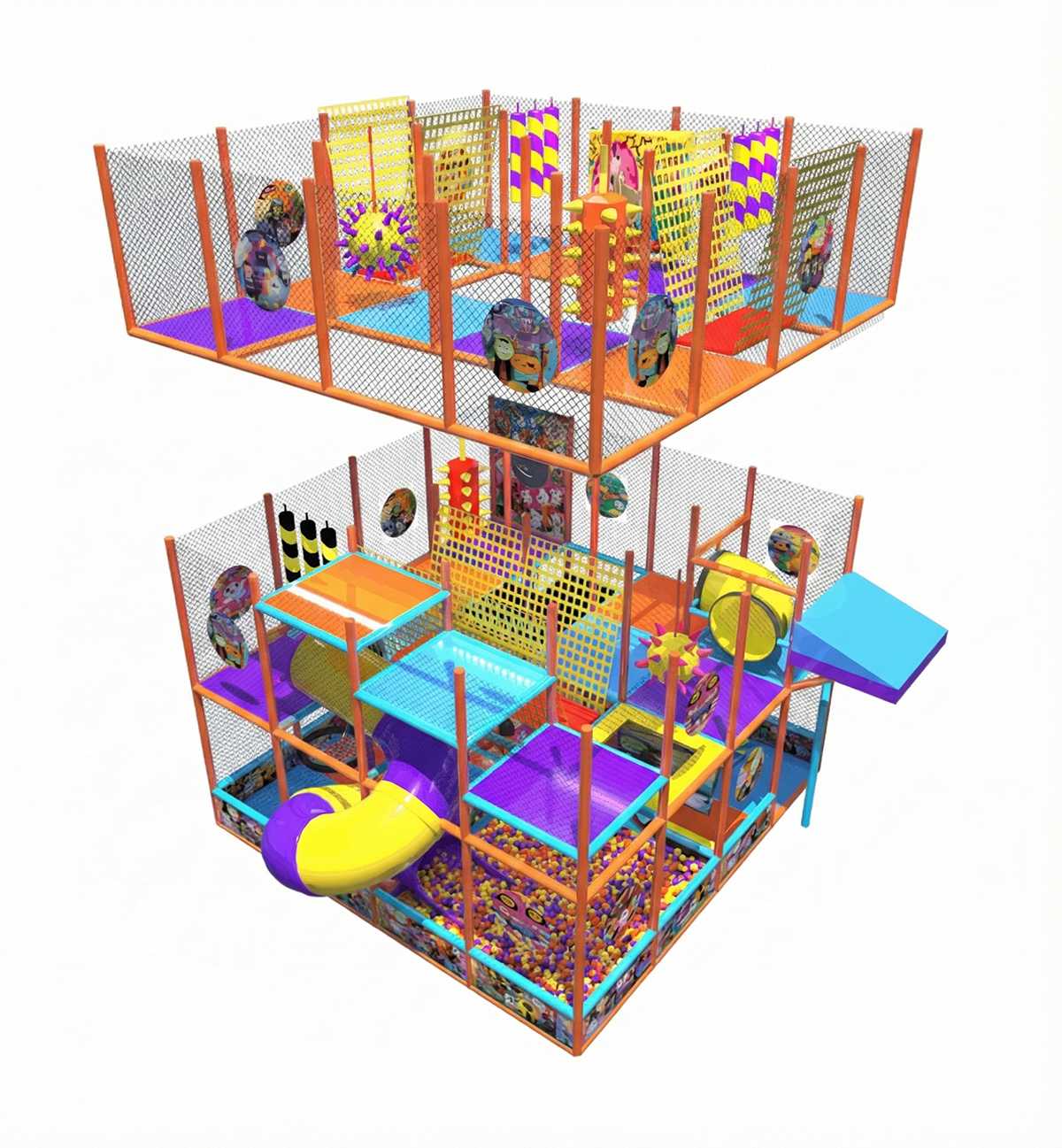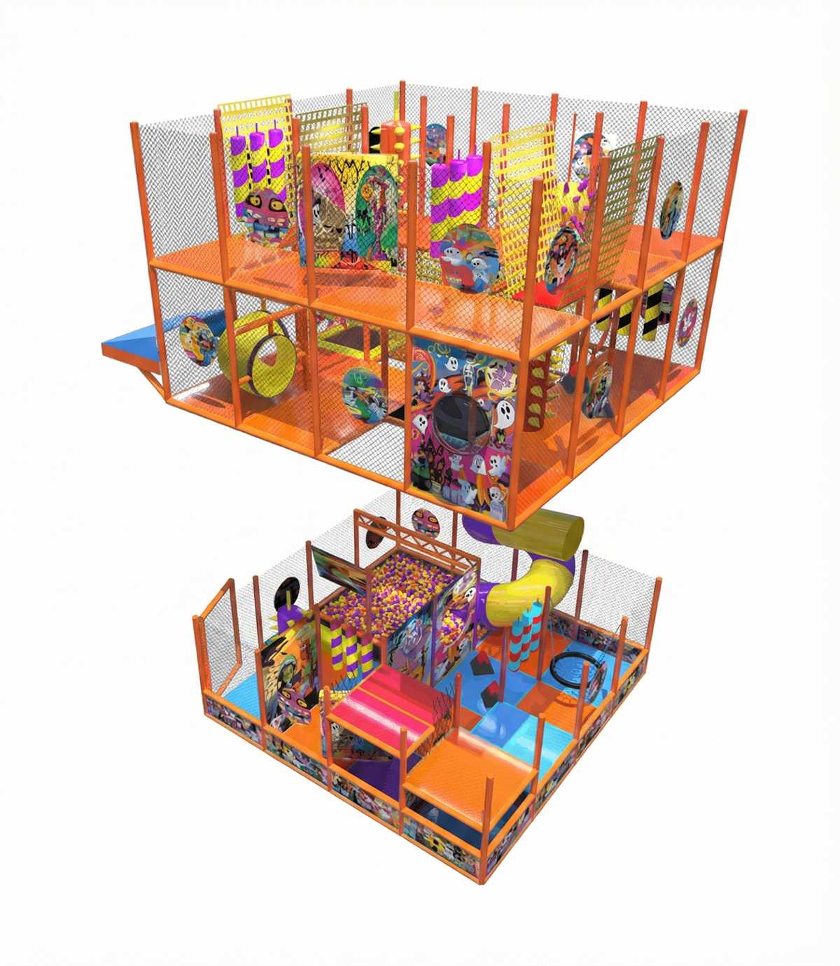 Конструкция занимает площадь около 24 м² и при этом устремляется вверх на три этажа. Это позволяет эффективно использовать пространство и создаёт ощущение настоящего приключения: дети поднимаются, спускаются, исследуют уровни и прокладывают собственные маршруты. Высота делает лабиринт заметным издалека, что особенно важно для торговых центров, парков и общественных пространств.
