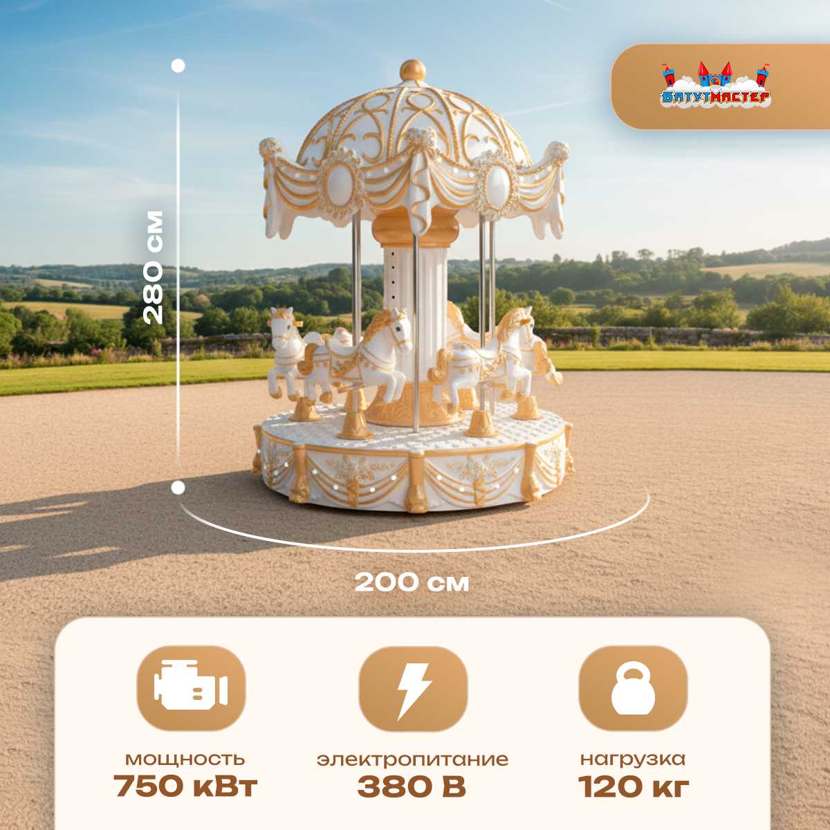 Свадебная карусель «Сияние» идеально подходит для установки как на открытых площадках, так и в закрытых помещениях. С её размером в 2 x 2,8 м она займет минимальную площадь, но при этом будет ярким акцентом на вашем мероприятии.