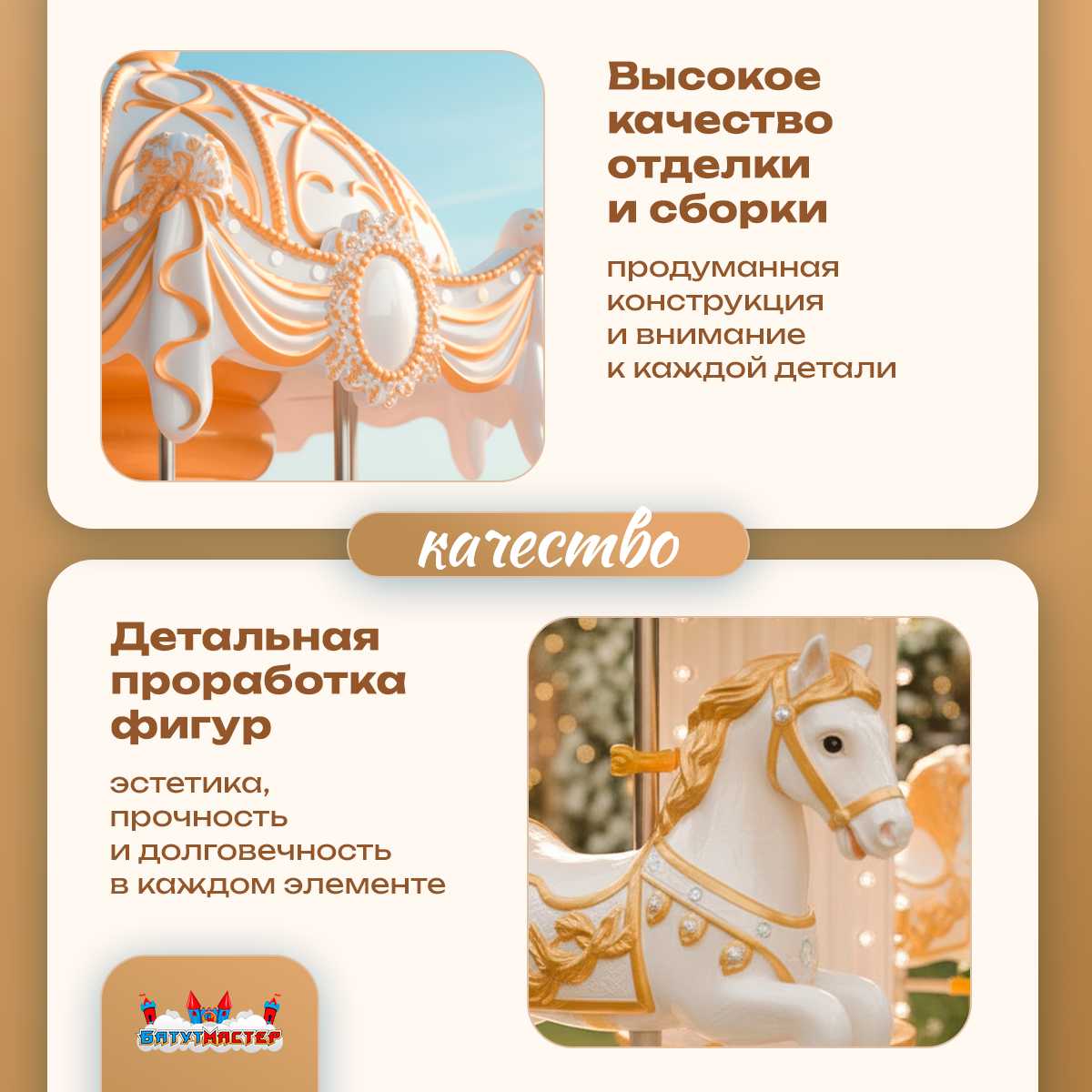 - Дизайн: Золотистые украшения и мягкая подсветка придают карусели утонченность и элегантность.